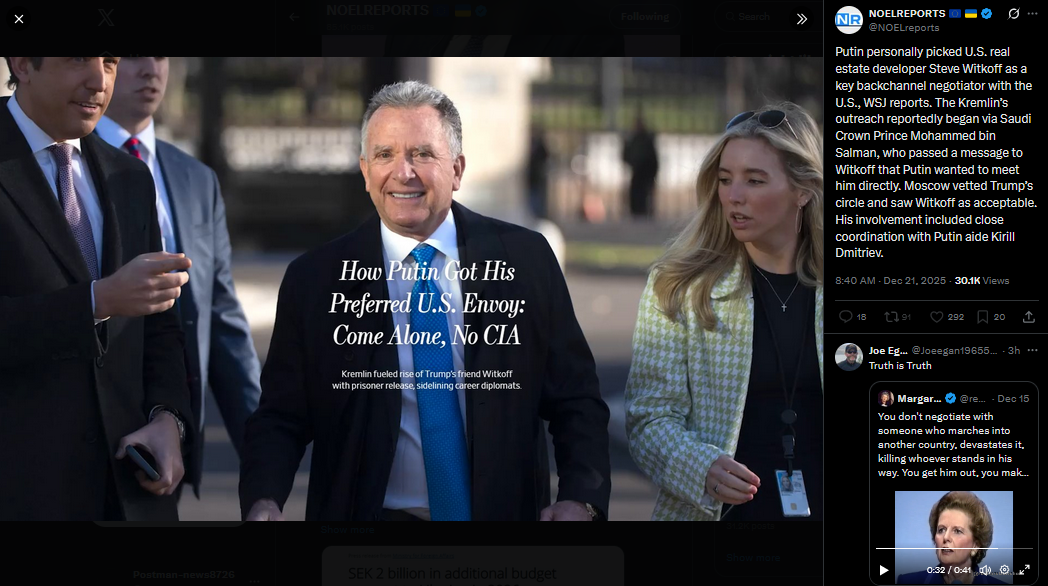 >>524117522Putin personally picked U.S. real estate developer Steve Witkoff as a key backchannel negotiator with the U.S., WSJ reports. The Kremlin’s outreach reportedly began via Saudi Crown Prince Mohammed bin Salman, who passed a message to Witkoff that Putin wanted to meet him directly. Moscow vetted Trump’s circle and saw Witkoff as acceptable. His involvement included close coordination with Putin aide Kirill Dmitriev.https://x.com/NOELreports/status/2002660425100337462?s=20