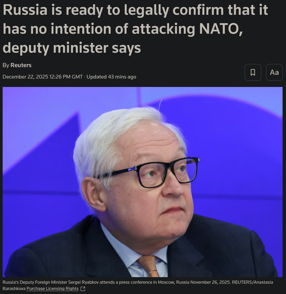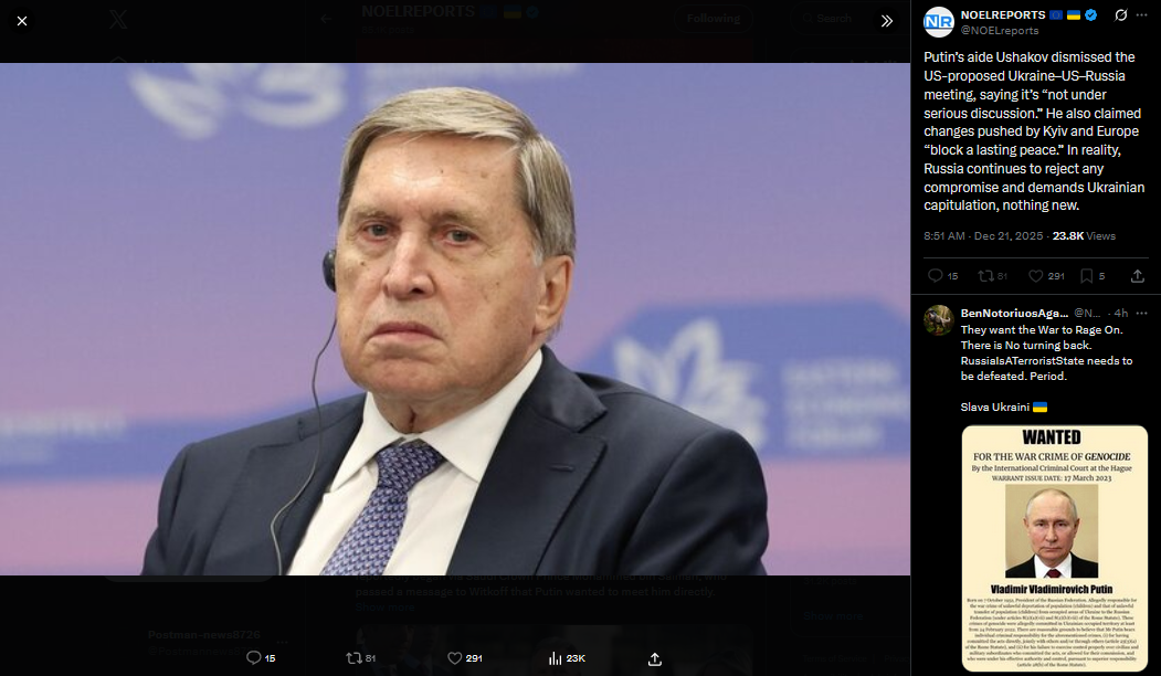 >>524117563Putin’s aide Ushakov dismissed the US-proposed Ukraine–US–Russia meeting, saying it’s “not under serious discussion.” He also claimed changes pushed by Kyiv and Europe “block a lasting peace.” In reality, Russia continues to reject any compromise and demands Ukrainian capitulation, nothing new.https://x.com/NOELreports/status/2002663142187258270?s=20>yesterday