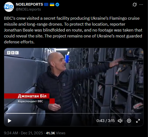 BBC's crew visited a secret facility producing Ukraine’s Flamingo cruise missile and long-range drones. To protect the location, reporter Jonathan Beale was blindfolded en route, and no footage was taken that could reveal the site. The project remains one of Ukraine’s most guarded defense efforts.https://x.com/NOELreports/status/2002671553029259421?s=20https://files.catbox.moe/h9ln0w.mp4