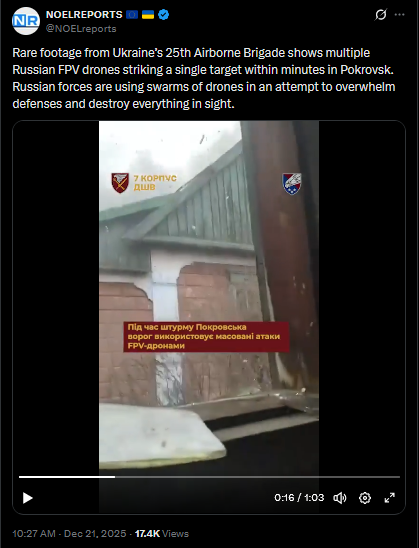 Rare footage from Ukraine’s 25th Airborne Brigade shows multiple Russian FPV drones striking a single target within minutes in Pokrovsk. Russian forces are using swarms of drones in an attempt to overwhelm defenses and destroy everything in sight.https://x.com/NOELreports/status/2002687300480934021?s=20https://files.catbox.moe/s8tlln.mp4