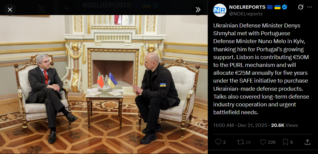 Ukrainian Defense Minister Denys Shmyhal met with Portuguese Defense Minister Nuno Melo in Kyiv, thanking him for Portugal’s growing support. Lisbon is contributing €50M to the PURL mechanism and will allocate €25M annually for five years under the SAFE initiative to purchase Ukrainian-made defense products. Talks also covered long-term defense industry cooperation and urgent battlefield needs.https://x.com/NOELreports/status/2002695744529080531?s=20