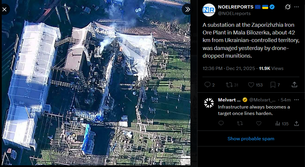 A substation at the Zaporizhzhia Iron Ore Plant in Mala Bilozerka, about 42 km from Ukrainian-controlled territory, was damaged yesterday by drone-dropped munitions.https://x.com/NOELreports/status/2002719765555794038?s=20>yesterday