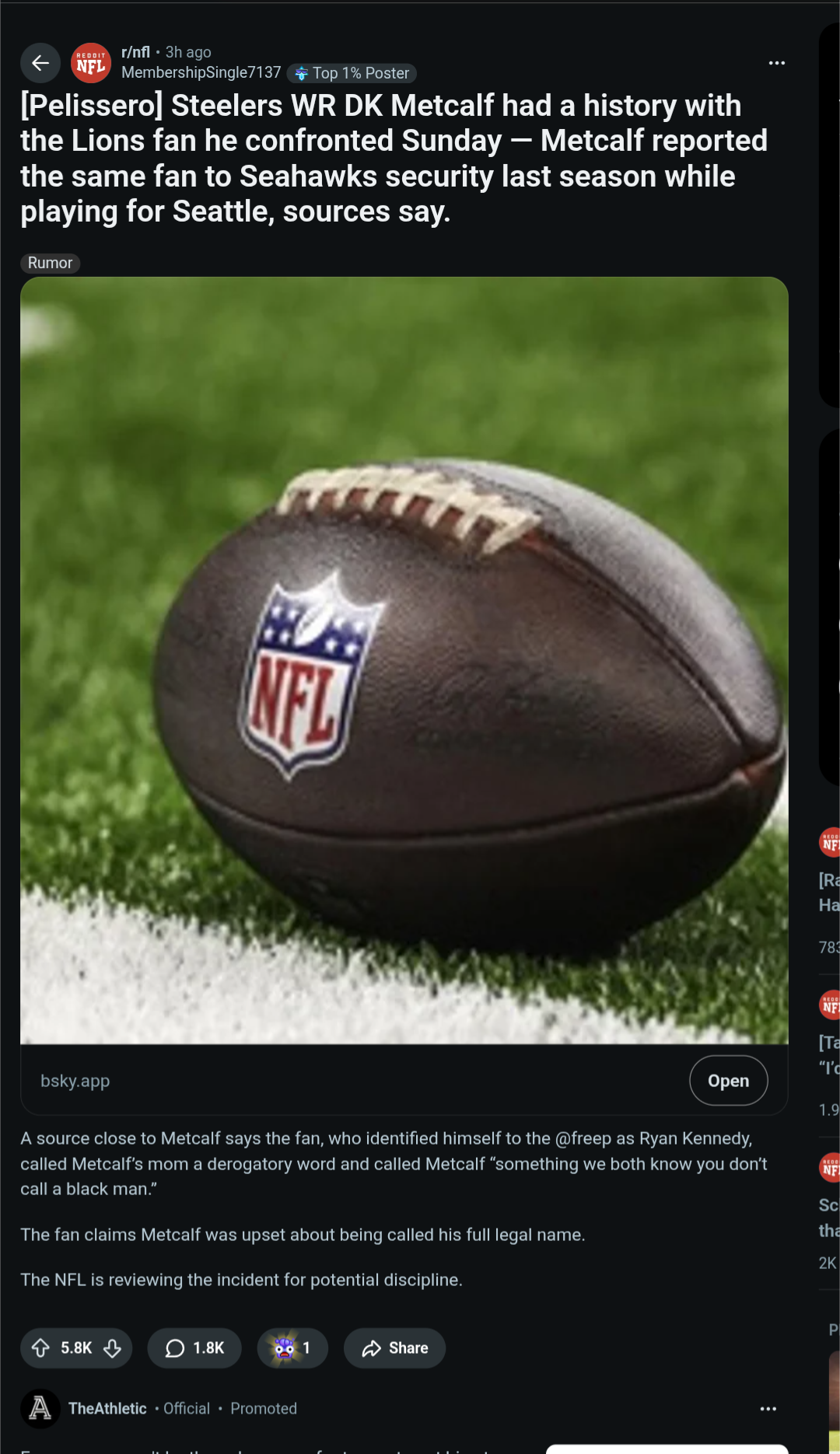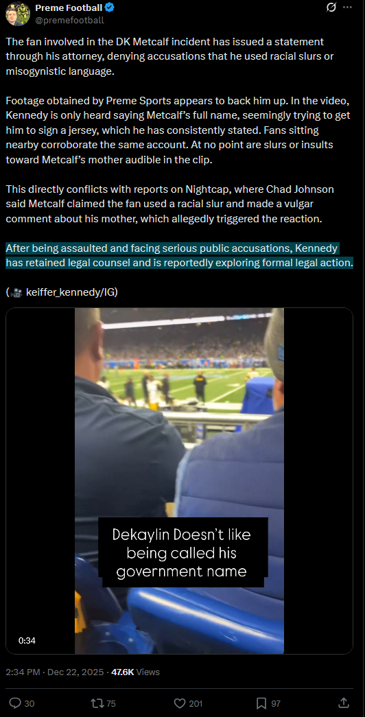 Reddit tards and NFL fans believe the player with ZERO proof. They are saying the white fan should be banned from all nfl stadiums and punished. This player would easily get suspended for multiple games for hitting a fan now he's just saying the fan was racist to get out of it https://xcancel.com/GhettoGronk/status/2002871647834161205#mhttps://www.reddit.com/r/nfl/comments/1pt3t8n/pelissero_steelers_wr_dk_metcalf_had_a_history/
