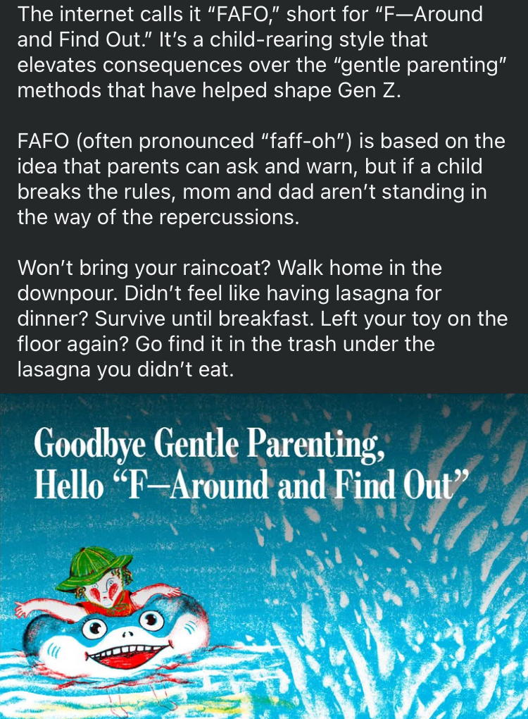 >>524144632That’s called good parenting. “Gentle parenting” is just amateur parents that try something they think it would work. If you have experience in parenting it’s FAFO all the way.
