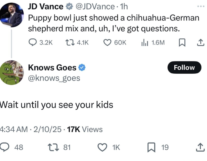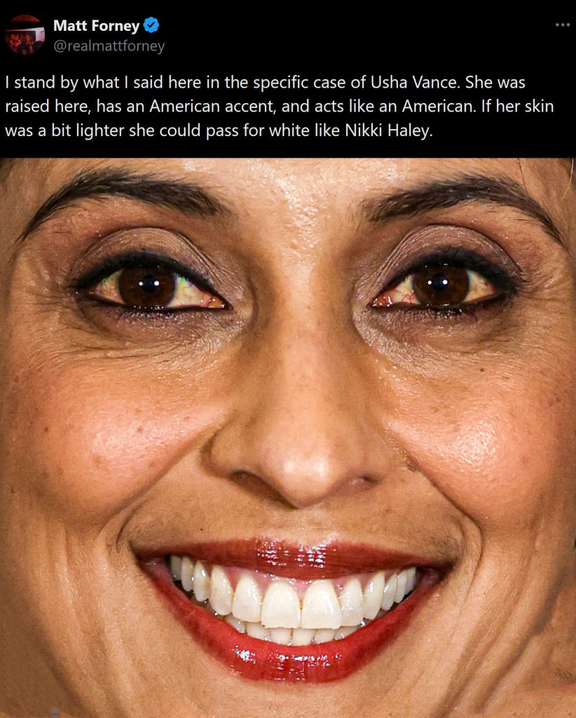 >>524149596>visibly brown tinted skin >rings around eyes>likely Mongol spotted at birth >partner will likely be of a similar racial background Lmao JD Vance flushed 10,000 years of genetics down in one fell swoop