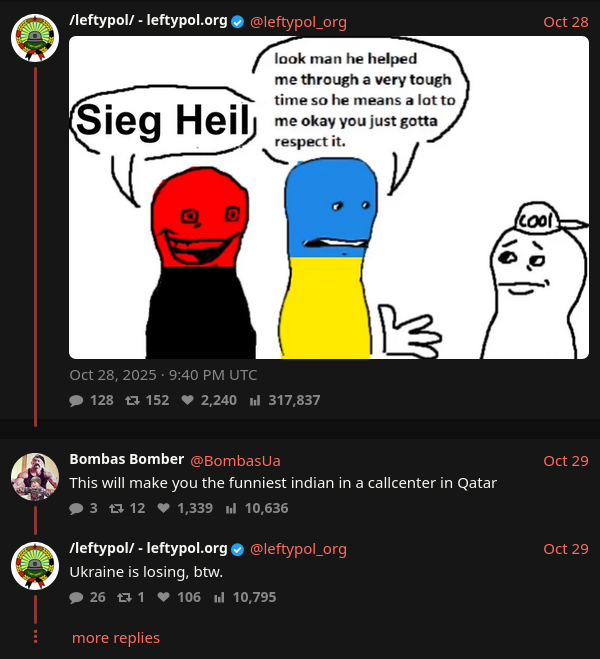 >>524150908Ironically there’s an edgy contingent of the left who are ALSO pro-Russian (just an edgy contingent of the Western right is), their reasoning is different though and it’s basically from being tankies who think Russia is basically secretly crypto-communist and based & they support the USSR and are against what they see as “the scheming capitalist imperialist machinations of the Western Atlanticists (EU, NATO, US)”, and/or also see Putin and Russia as more aligned with some of the Third World, Global South, or anti-Western axis generally, as helpers to some of them (as e.g. economic and/or military ties with nations from Venezuela to Iran to Assad’s Syria) and hence also part of an axis of resistance against the Imperialist Capitalist NATO-led West.Whew yeah but basically Russians successfully get both some retarded tankies and some retarded Nazis or right-wingers to support them, they’re not too bad at information warfare and exploiting the modern Internet and social media to push their agenda.