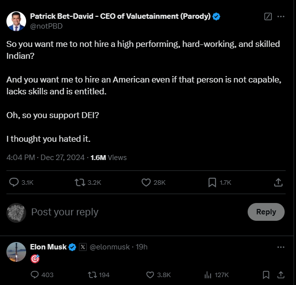 >>524151815>I love America it gave the opportunity to become the world's richest man>I'm going to start an America political party because I love America >BTW I don't want to invest in America because the workers are lazy and it's expensive >now give me another trillion dollars and 10 000 h1b visas so I can build a base on mars in 100 years while promising 20
