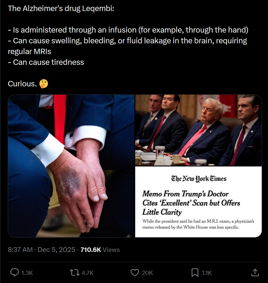>>524153321The hand bruise is the transfusion site for the anti-Alzheimers medication he is takingAnd the facial droop is evidence of a recent stroke, or death of brain tissue