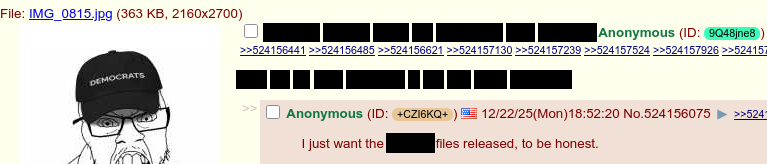 >>524158067>This retard doesn’t even understand why the files are legally required to be redacted. Massie even fucking knows this based on the text of his bill.They are hiding the politicians in the file:https://www.foxnews.com/politics/epstein-files-explode-open-doj-details-discovery-powerful-figures-more-than-1200-victims>The Justice Department redacted the names and identifiers of victims. Fox News Digital has learned that the same redaction standards were applied to politically exposed individuals and government officials.