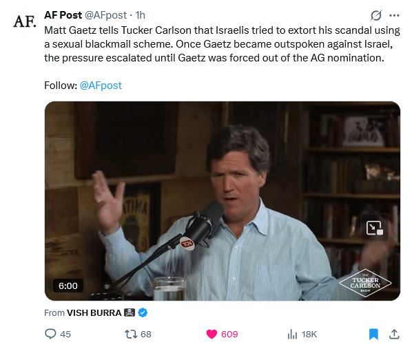 >Matt Gaetz tells Tucker Carlson that Israelis tried to extort his scandal using a sexual blackmail scheme. Once Gaetz became outspoken against Israel, the pressure escalated until Gaetz was forced out of the AG nomination.https://x.com/AFpost/status/2003285905004765225Are you interested in learning more about the US-Israel special relationship? Read the following thread:https://archive.4plebs.org/pol/thread/522660170/#522660236