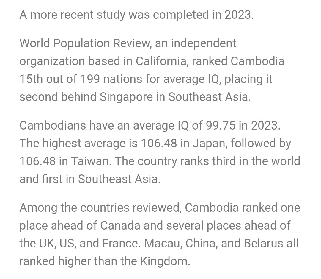 >>5242163121000 riel is 25 cents. A soda is 50. Cambodia is literally just US prices in 1995 before your country's inflation went to shit>>524207638Khmer Rouge supposedly executed all people with glasses, which, in a feudal agrarian society, doesn't kill off the intellectuals, it just kills the people who have access to optometry and can afford glasses. Why would you assume that only the affluent and urban elite would be intelligent? Says much about your own intellect, ironically>>524208348Cambodian IQ has risen by almost 30 points in 10 years if your metric is correct (which places us much higher than Thailand and even higher than the US and UK, which is... believable), but good thing I don't put much weight into IQ anywaysoutsourceasia.org/cambodia-has-15th-highest-iq-in-the-world/