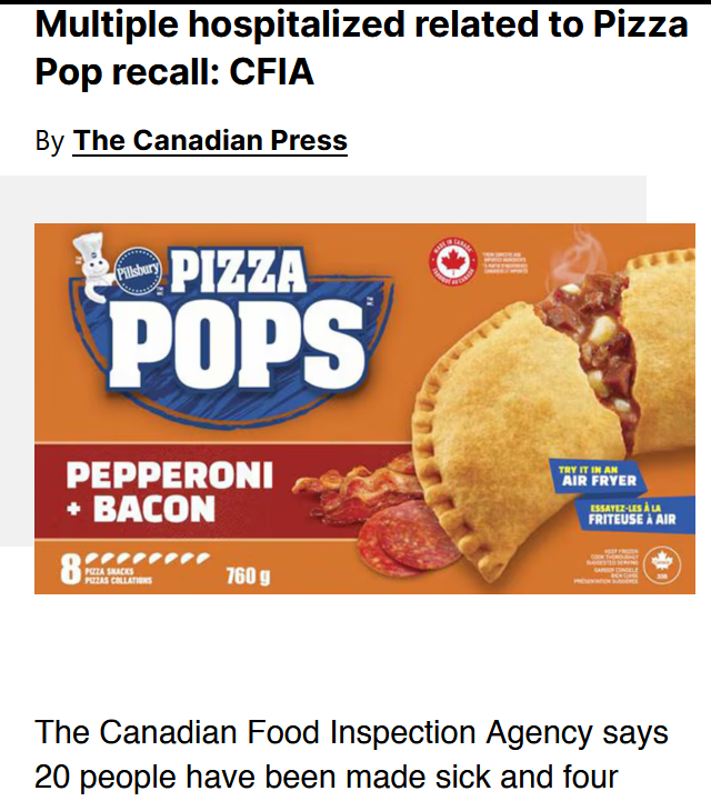 Why are modern food standards falling? 20 people were hospitalized by Pizza Pops. >The Canadian Food Inspection Agency says 20 people have been made sick and four hospitalized after an outbreak of E. coli infections linked to Pillsbury brand Pizza Pops.