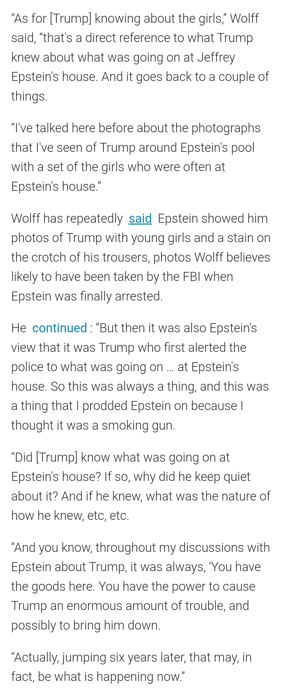 >>524176858Epstein was arrested in 2006, and he'd been operating since the '90s.Even to be as charitable as possible, Virginia Roberts was recruited in 2001, so he'd have to have been operating then, and Trump's infamous New York magazine quote about the "terrific" Epstein liking girls "on the younger side" was a year later in 2002, and the birthday card was a year after that.And why don't you fags have any shame about citing AI? The actual content of that Raw Story article is hardly as charitable as you want it to be:>“As for [Trump] knowing about the girls,” Wolff said, “that's a direct reference to what Trump knew about what was going on at Jeffrey Epstein's house. And it goes back to a couple of things.>“I've talked here before about the photographs that I've seen of Trump around Epstein's pool with a set of the girls who were often at Epstein's house.”>Wolff has repeatedly said Epstein showed him photos of Trump with young girls and a stain on the crotch of his trousers, photos Wolff believes likely to have been taken by the FBI when Epstein was finally arrested.>He continued: “But then it was also Epstein's view that it was Trump who first alerted the police to what was going on … at Epstein's house. So this was always a thing, and this was a thing that I prodded Epstein on because I thought it was a smoking gun.>“Did [Trump] know what was going on at Epstein's house? If so, why did he keep quiet about it? And if he knew, what was the nature of how he knew, etc, etc.>“And you know, throughout my discussions with Epstein about Trump, it was always, ‘You have the goods here. You have the power to cause Trump an enormous amount of trouble, and possibly to bring him down.>“Actually, jumping six years later, that may, in fact, be what is happening now.”https://www.rawstory.com/trump-epstein-2674294359/You can't take one sentence you like, and disregard the rest.