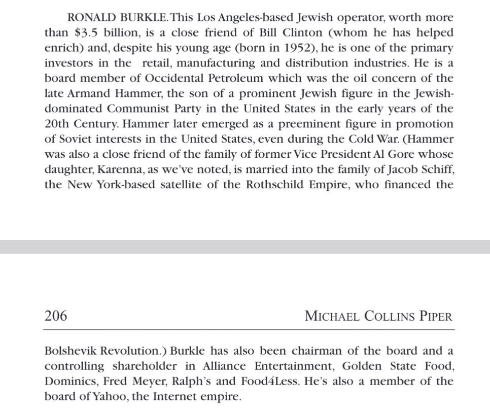 >>524178669Ron Burkle is a very interesting figure. Gawker did some of the very first Epstein coverage in 2006, and eventually compared him to Burkle - whose lawyers were none too pleased.Gawker covered their relationship, revealed how much Ron liked the Lolita Express, and even released the photo of Bill Clinton with Rachel Chandler on his plane - an image that's been used for well-poisoning, falsely attributing it to Epstein's and pretending Chandler was a "handler", because it rhymed.They also outlined their falling out:>First, it appears that Epstein might have been horning in on Burkle's most precious personnel acquisition, that perpetual charm machine known as William Jefferson Clinton. In the Burkle-fluffing Forbes article mentioned earlier, Burkle makes no secret how much he loves the access and visibility that Consultant Clinton grants his business ventures. [. . .]In any case, Epstein also recognized Clinton's asset value, taking the ex-prez for rides on his jet (like Burkle did and does) and organizing a dinner in Clinton's honor at Epstein's East Side townhouse. Burkle probably didn't appreciate all these overtures, even if Clinton maintained there was plenty Bill to go around.https://web.archive.org/web/20100823194845/https://gawker.com/217755/ron-burkle-vs-jeffrey-epstein-probable-causehttps://web.archive.org/web/20111214044641/https://gawker.com/190980/shady-billionaire-rundown-ron-burkle-vs-jeffrey-epsteinhttps://web.archive.org/web/20101205134746/http://www.gawker.com/news/legal/today-in-the-adventures-of-ron-burkles-lawyer-190588.phphttps://web.archive.org/web/20090926081318/http://gawker.com/news/ron-burkle/ron-burkle-once-hearted-jeffrey-epsteins-plane-dinner-menu-217421.phpBurkle's jet even had a cute nickname: "Air Fuck One".https://www.mediaite.com/media/print/ron-burkle-throws-bill-clinton-under-the-bus/He was also close with Diddy, and a major investor in his clothing brand.