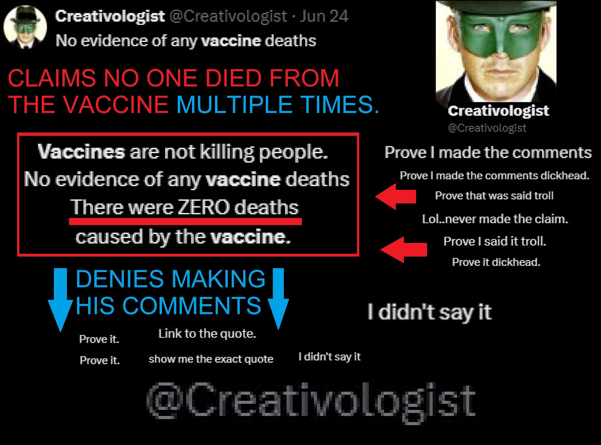 >>524194781> This doesn't do anythingOk, so you’re a bot then Or a brainless NPC that spouts the same shit over and over mindlesslyNotice how this entire time I’ve never once mentioned whether or not I took the vaccineGuess what dumbass, I didn’tBut you think that anyone who makes fun of you must have, because of your mental illness. I mean this in all sincerity, you need serious help, assuming you’re an actual human and not a botI know you won’t listen, but I’d feel bad if i didn’t at least say something. Get help dude. 5 years of this isn’t accomplishing anythingAll the best