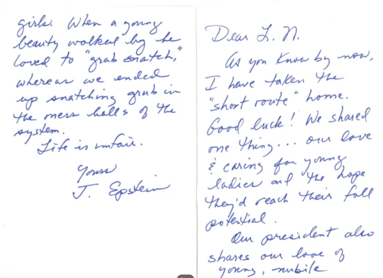 Was I fucking wrong about trump? Am I crazy? Dear L. N. (Larry Nassar) As you know by now, I have taken the "short route" home. Good luck! We shared one thing . . . our love & caring for young ladies and the hope they'd reach their full potential. Our president shares our love of young, nubile girls. When a young beauty walked by he loved to "grab snatch", whereas we ended up snatching grub in the mess halls of the system. Life is unfair. Yours J. Epstein