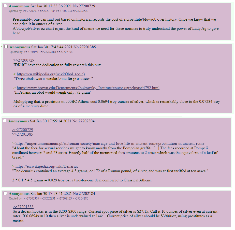 >>524184216What? Silver is $69 an ounce. That's at least $213,900 of silver sitting on the yellow container on the picture. I count one 1,000 ounce bar, probably a 500 ounce bar on top of it, and 16 100 ounce bars.Gold is $4,489 an ounce and I see 14 coins probably close to 14 ounces more or less, and then a 10 oz bar. So that's $107,736 of gold.>This man is betting on the spread between gold and silver to close and then bring him insane gains. It's risky, but obviously this man has no children to worry about given the Japanese beer and anime girl figurines.
