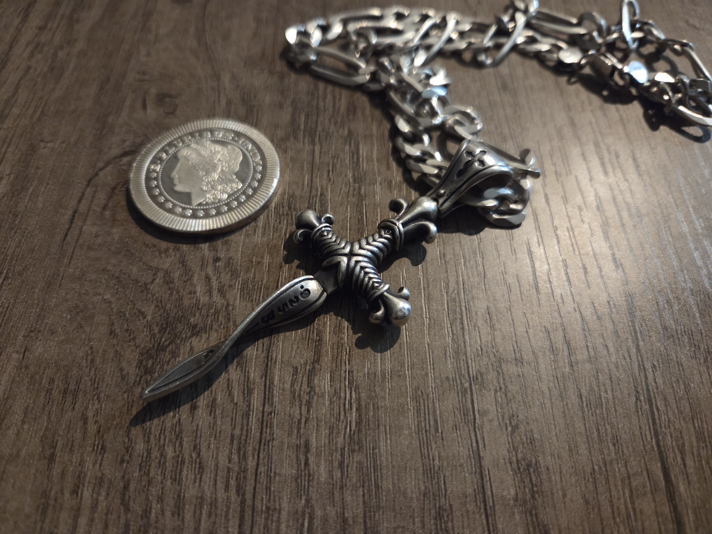 >>524191065Check out this pendant I bought. Its called twisted blade and im pretty sure they dont make it anymore. The lady had another one and 2 more that were smaller. $130 for the large ones (the one in photo.) I should have bought all 4 or at least the second $130 one but I was broke at rhe time and had to make decisions based on that. 1oz silver round for comparison