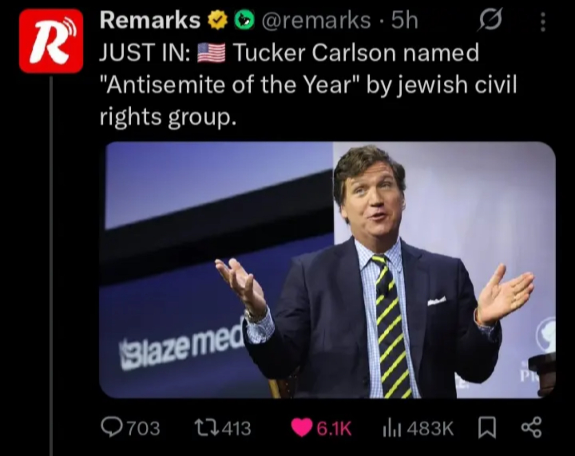 >>524199952And tucker sucks the cock of jews, so he's obviously controlled opposition. Watch the "antisemite of the year" NOT calll for Jewish assets confiscation and expulsion.