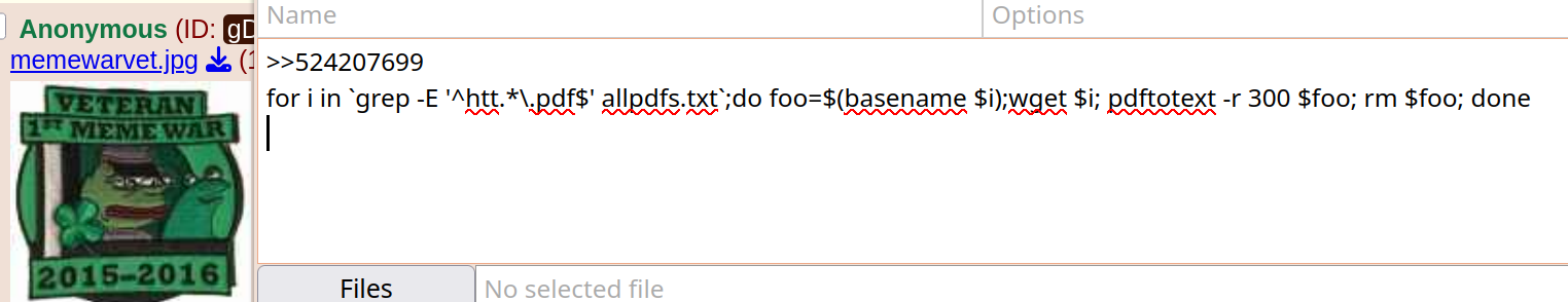 >>524205446Not wasting my weaponized autism on this one.The way we used to do this automatically during the meme wars was using pdftotext on Linux based OS. Put URLs of pdfs into file allpdfs.txt, one per line. Then from terminal prompt:[code]for i in `grep -E '^htt.*\.pdf