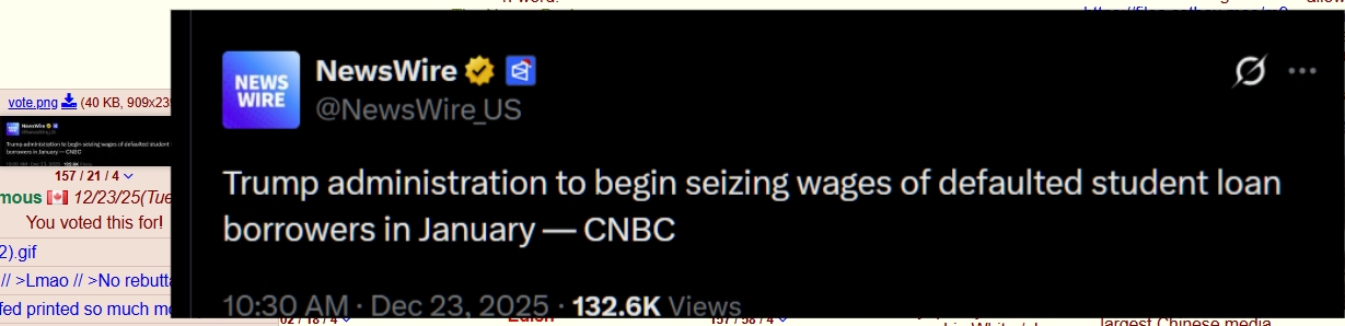 >>524211680Yep.That just means those loans are in default. If your headline is right, then whoever has those defaulted loans are about to have their wages garnished in order to pay them. A bit like over-due child support.Some pretty dystopian shit, if true.