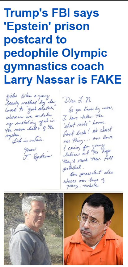 >The prison postcard released in the Epstein files, allegedly written by Jeffrey Epstein to former US Olympic doctor Larry Nassar before his suicide, has been ruled as fake by the FBI. >Allegedly written before Epstein killed himself in his jail cell in 2019, the contents included a claim that 'our president' loves 'young, nubile girls.' Donald Trump was the president at the time, although there were no named references to him. So what is real in the docs?