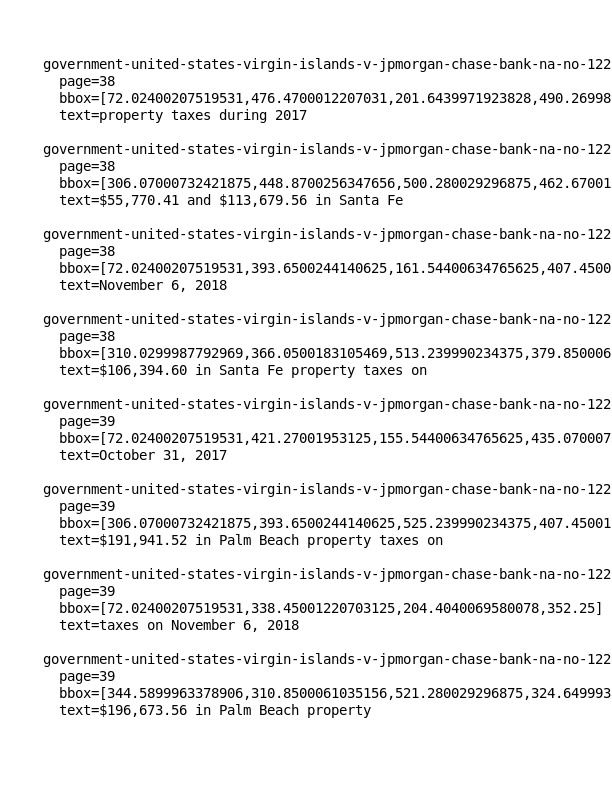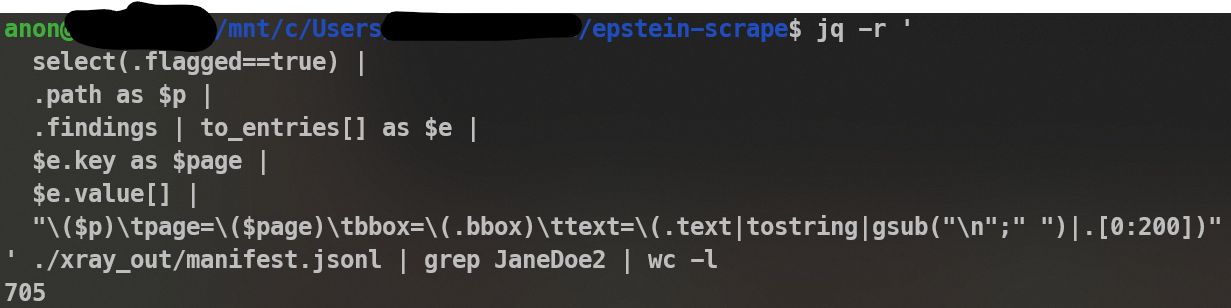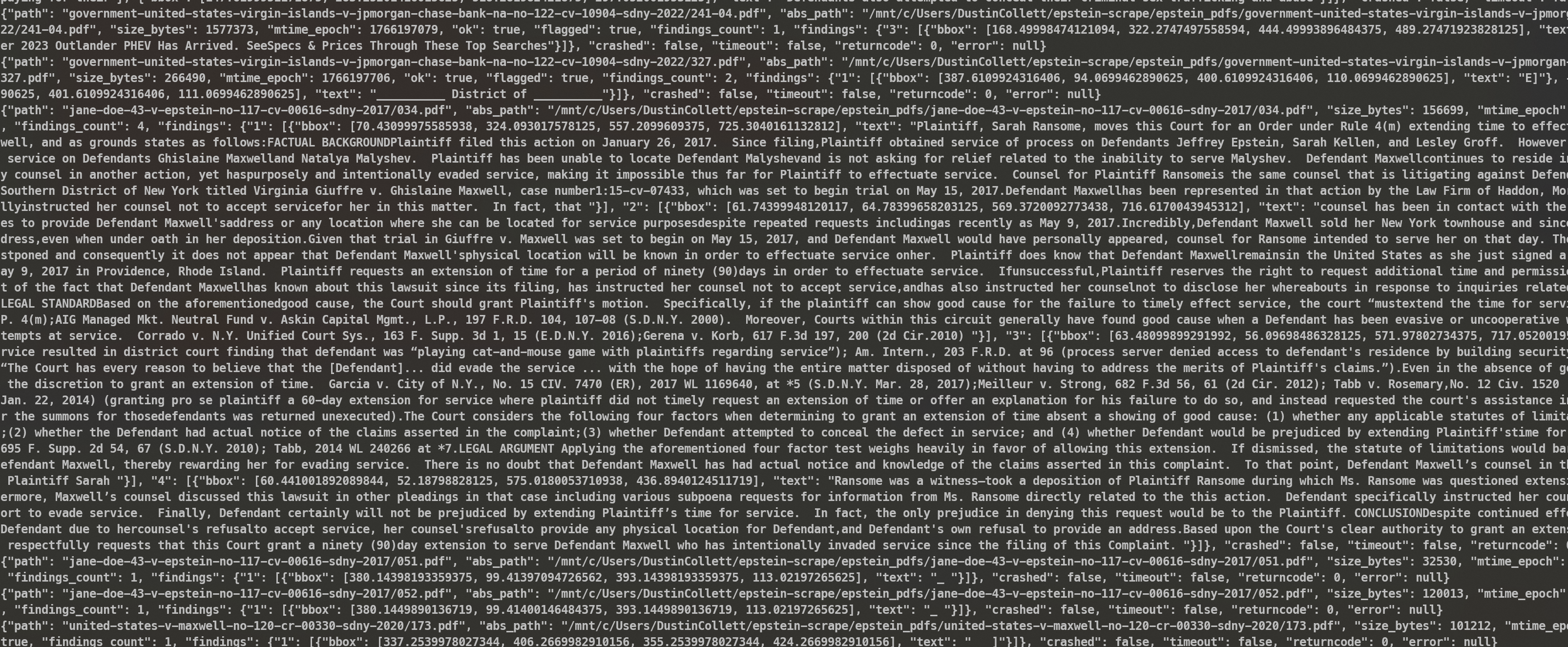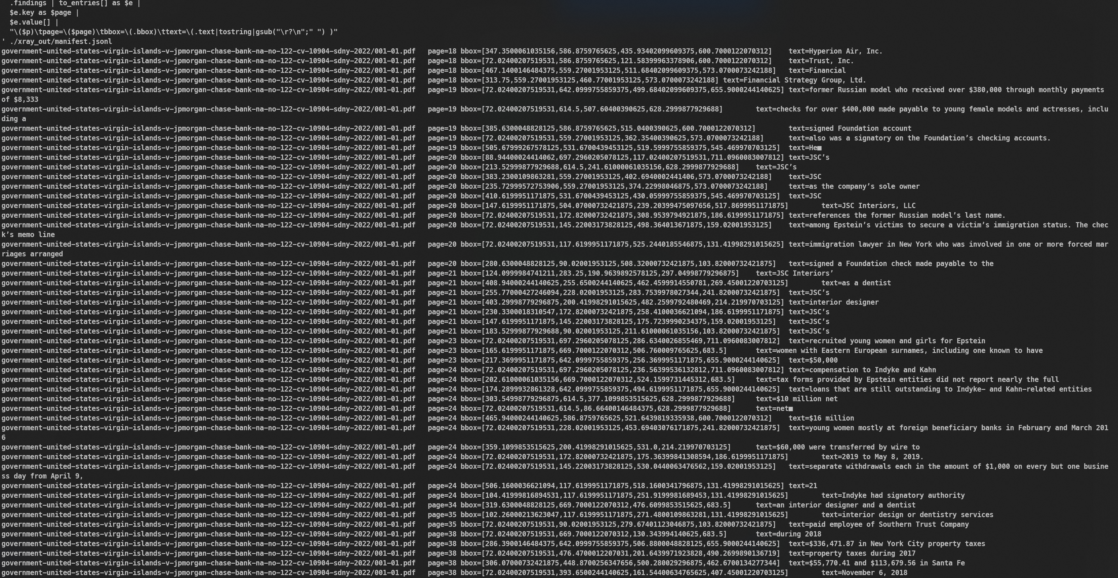 Hey all I've run through these PDF files and have all the redactions gone as far as can be done. Quote a few. For example, "JaneDoe2" is redacted 702 times so it seems we have 'speculation fuel' which is fun.Here are the top redacted files where problems in the redactions were found:159 giuffre-v-maxwell-no-115-cv-07433-sdny-2015/1327-11.pdf114 giuffre-v-maxwell-no-115-cv-07433-sdny-2015/1325-02.pdf73 giuffre-v-maxwell-no-115-cv-07433-sdny-2015/1326-4.pdf72 giuffre-v-maxwell-no-115-cv-07433-sdny-2015/1326-3.pdf65 government-united-states-virgin-islands-v-jpmorgan-chase-bank-na-no-122-cv-10904-sdny-2022/145-01.pdf65 government-united-states-virgin-islands-v-jpmorgan-chase-bank-na-no-122-cv-10904-sdny-2022/119-01.pdf65 government-united-states-virgin-islands-v-jpmorgan-chase-bank-na-no-122-cv-10904-sdny-2022/109-01.pdf65 government-united-states-virgin-islands-v-jpmorgan-chase-bank-na-no-122-cv-10904-sdny-2022/047-02.pdf65 government-united-states-virgin-islands-v-jpmorgan-chase-bank-na-no-122-cv-10904-sdny-2022/016-01.pdf65 government-united-states-virgin-islands-v-jpmorgan-chase-bank-na-no-122-cv-10904-sdny-2022/001-01.pdf65 court-records/2022.03.17-1%20Exhibit%201.pdf57 giuffre-v-maxwell-no-115-cv-07433-sdny-2015/1327-03.pdf49 giuffre-v-maxwell-no-115-cv-07433-sdny-2015/1335-7.pdf37 giuffre-v-maxwell-no-115-cv-07433-sdny-2015/1335-1.pdf33 giuffre-v-maxwell-no-115-cv-07433-sdny-2015/1328-18.pdfAsk me anything I have detailed files. Problem is I don't care about this but... maybe someone else does?