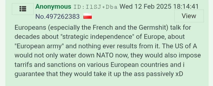 >>524276687BTW, it is wise to read my posts. Thats my post from February 12. Literally few days later, on February 26, the US threatened EU with 25% tarrifs causing "huge shock". On April 2 Trump signed Executive Order 14257 invoking IEEPA for reciprocal tariffs on non-sanctioned countries, including the EU. Watering down US NATO obligations is very advanced too now, it happens all the time. Like few weeks ago Scott Bessent, Secretary of the Treasury, said in MSM interview that the US would not get directly involved in situation of Russia invading NATO countries. The US of A would only sell weapons to attacked European states.I have access to friends who are still in active service hence i know a lot about current administration, its plans, strategies etc. I am an expert on Muttland, its real intentions/capabilites and self-acclaimed expert on "covid vaccines" too. It is worth reading me on this two topics. I never lie xD