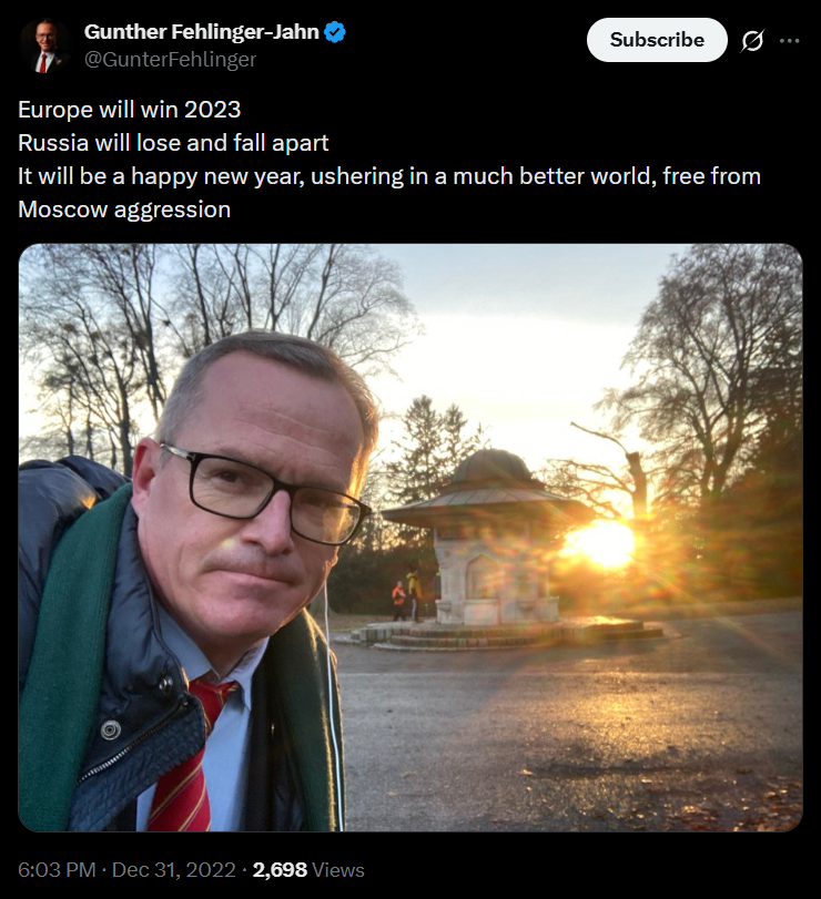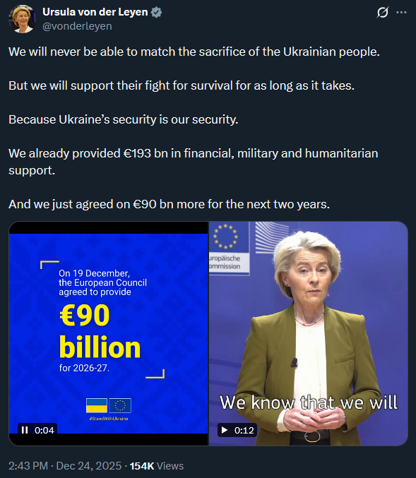 >We will never be able to match the sacrifice of the Ukraine's people.>But we will support their fight for survival for as long as it takes.>Because the Ukraine’s security is our security.>We already provided €193 bn in financial, military and humanitarian support.>And we just agreed on €90 bn more for the next two years.The sniffer got a Chrimmas present.