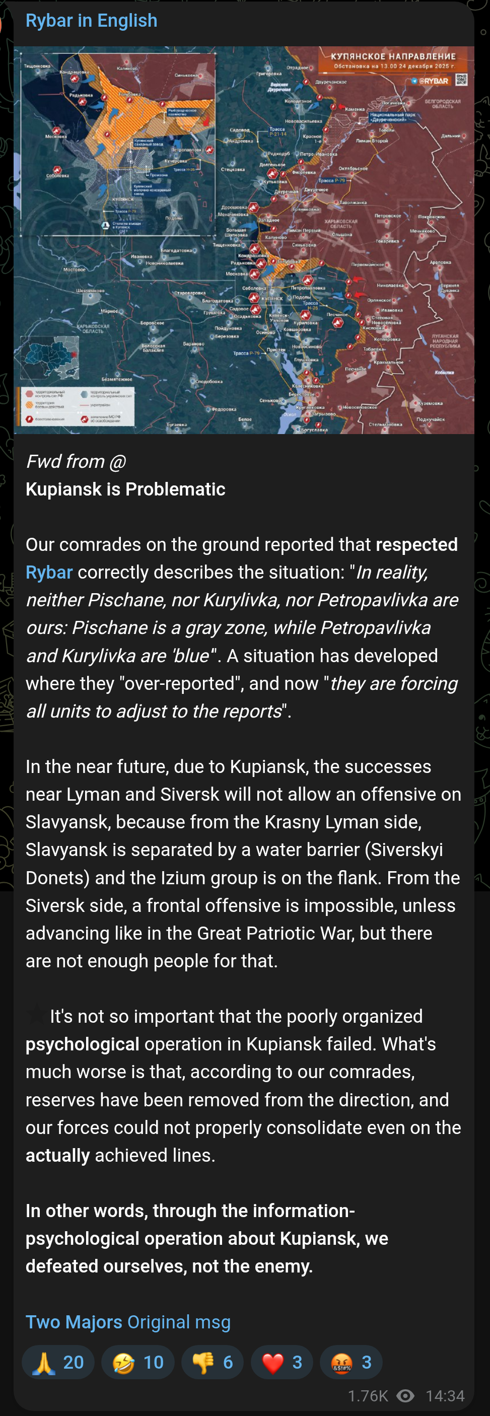 >>524276151What do you make of this post on Rybar? >In other words, through the information-psychological operation about Kupiansk, we defeated ourselves, not the enemy.