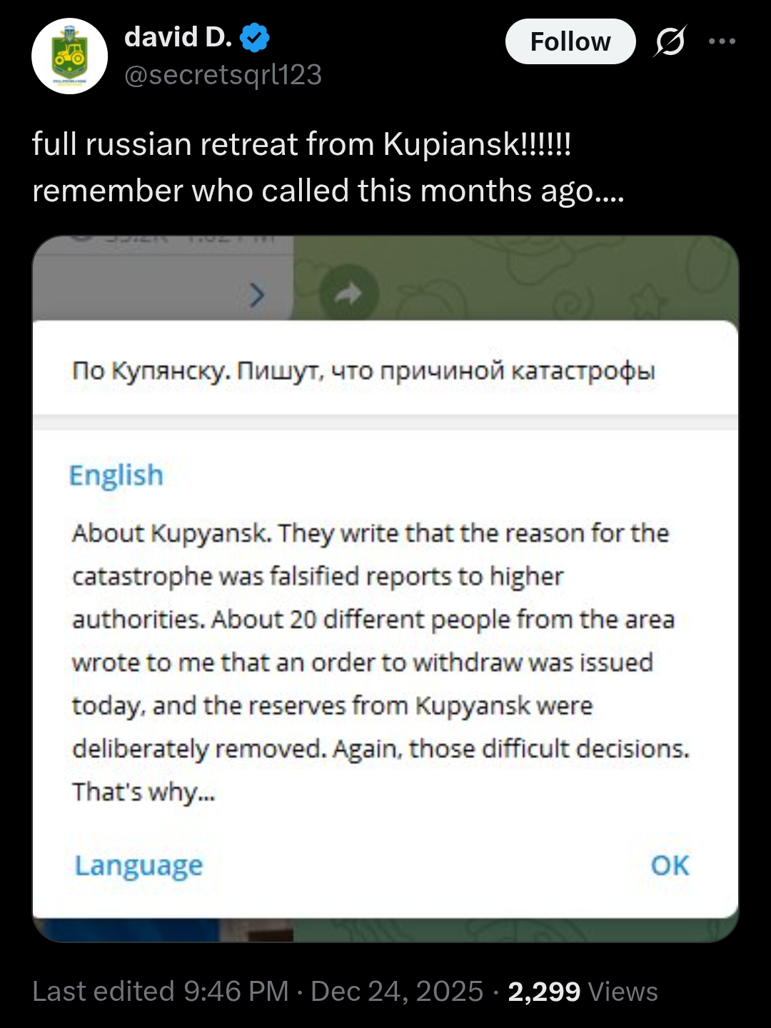 >full russian retreat from Kupiansk!!!!!!>remember who called this months ago....it's so yvir