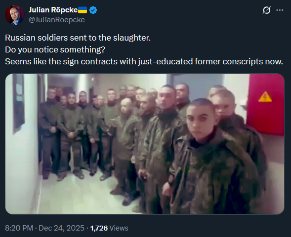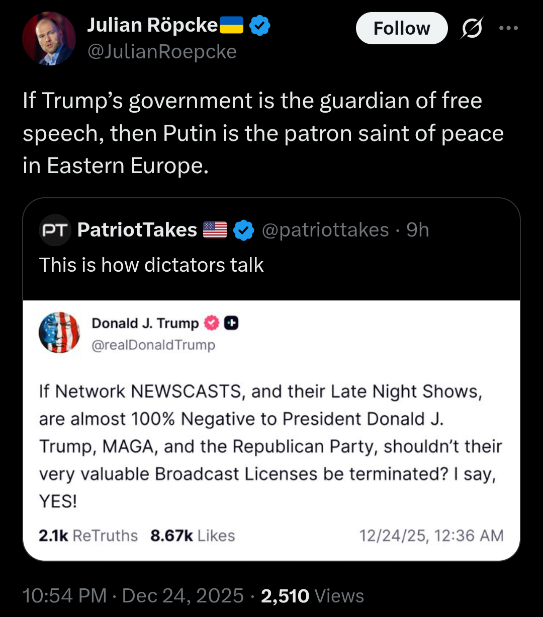 https://x.com/JulianRoepcke/status/2003932229513499018>If Trump’s government is the guardian of free speech, then Putin is the patron saint of peace in Eastern Europe.