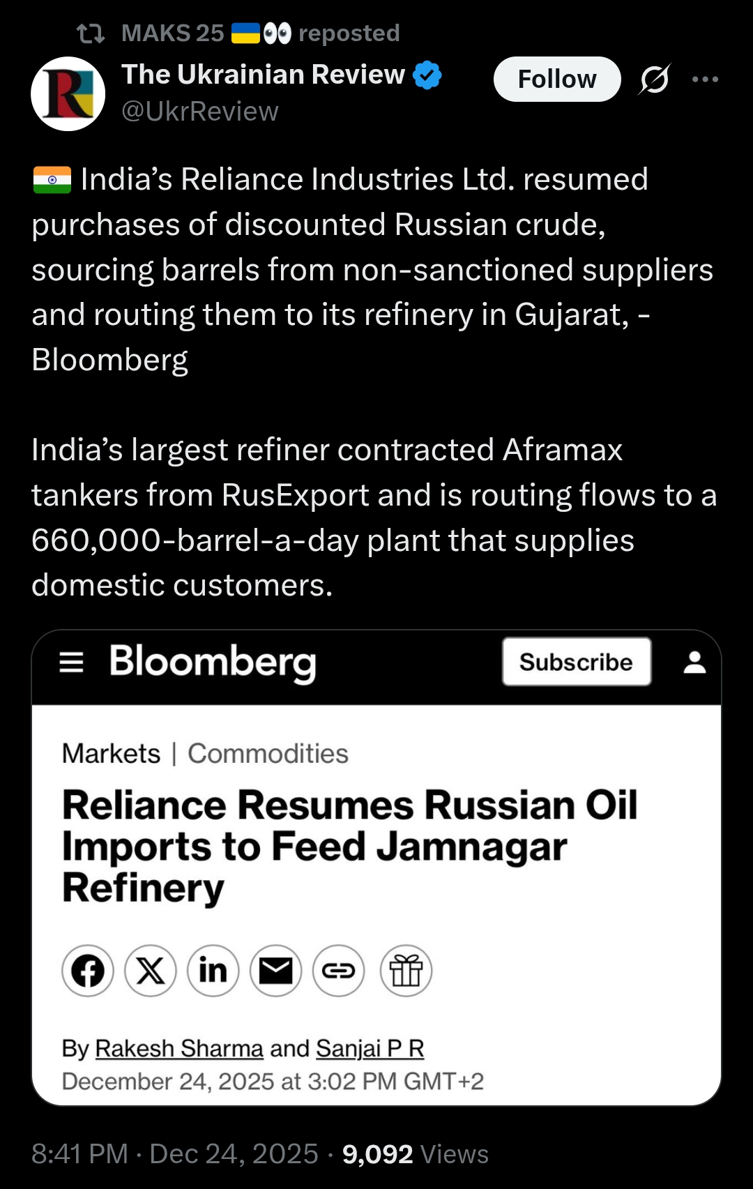 >India’s Reliance Industries Ltd. resumed purchases of discounted Russian crude, sourcing barrels from non-sanctioned suppliers and routing them to its refinery in Gujarat, - Bloomberg>India’s largest refiner contracted Aframax tankers from RusExport and is routing flows to a 660,000-barrel-a-day plant that supplies domestic customers.damn terror friends