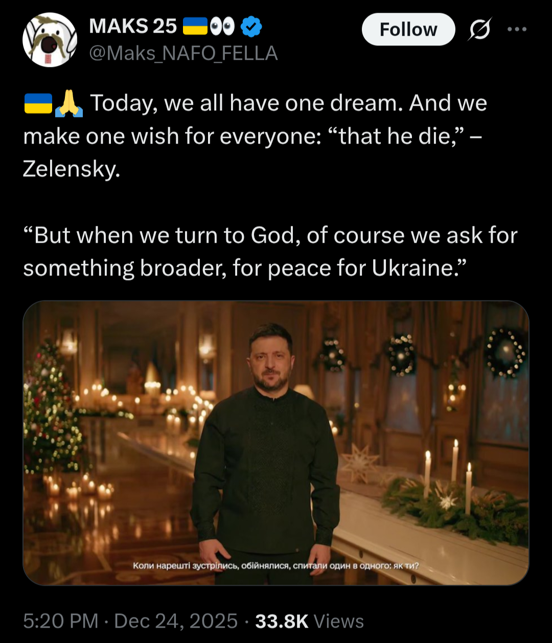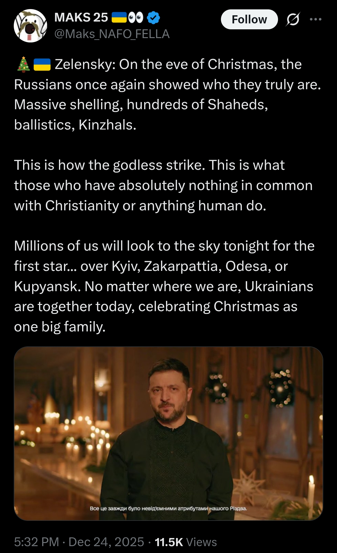 > Zelensky: On the eve of Christmas, the Russians once again showed who they truly are. Massive shelling, hundreds of Shaheds, ballistics, Kinzhals.>This is how the godless strike. This is what those who have absolutely nothing in common with Christianity or anything human do.>Millions of us will look to the sky tonight for the first star... over Kyiv, Zakarpattia, Odesa, or Kupyansk. No matter where we are, Ukrainians are together today, celebrating Christmas as one big family.