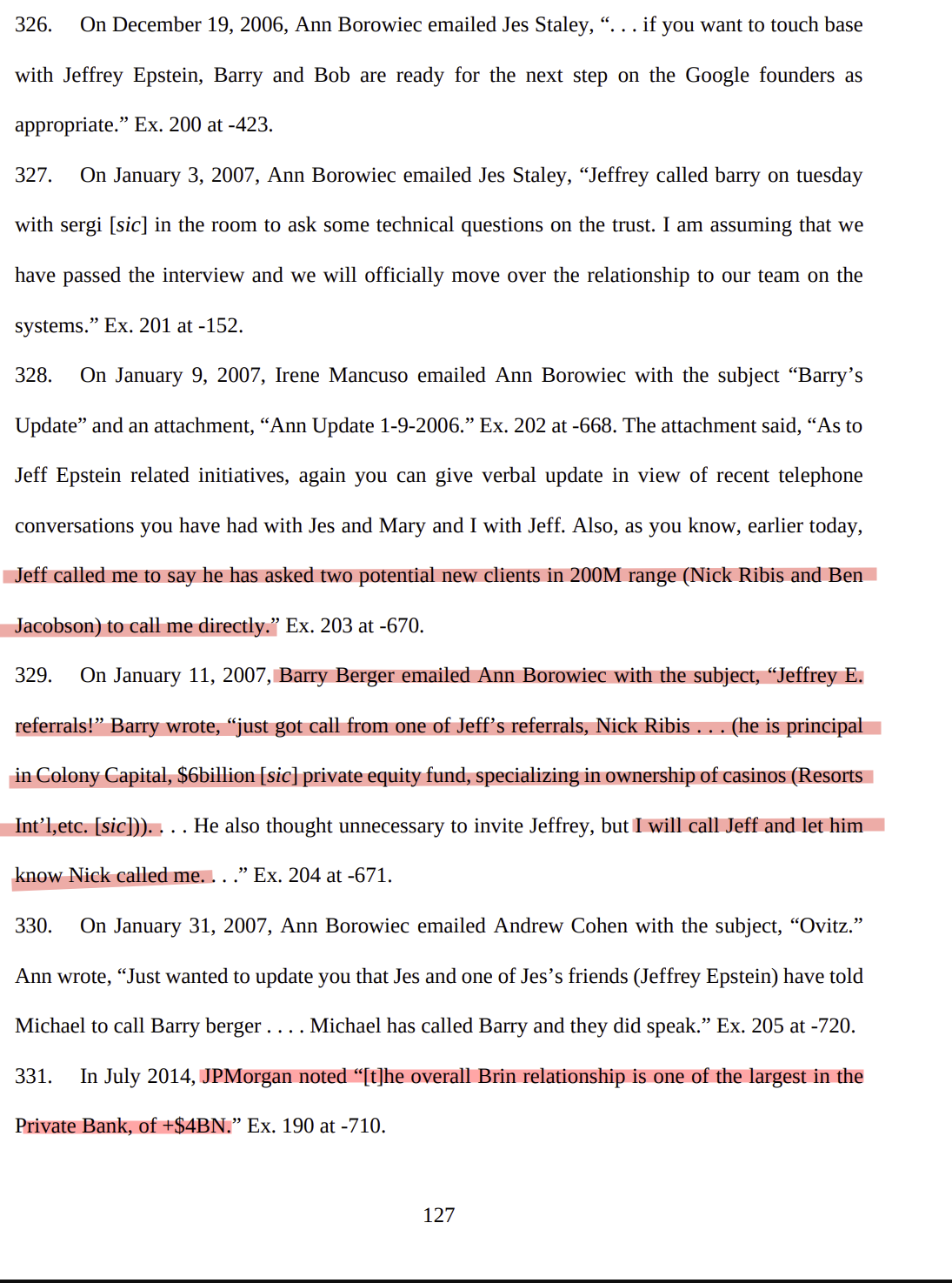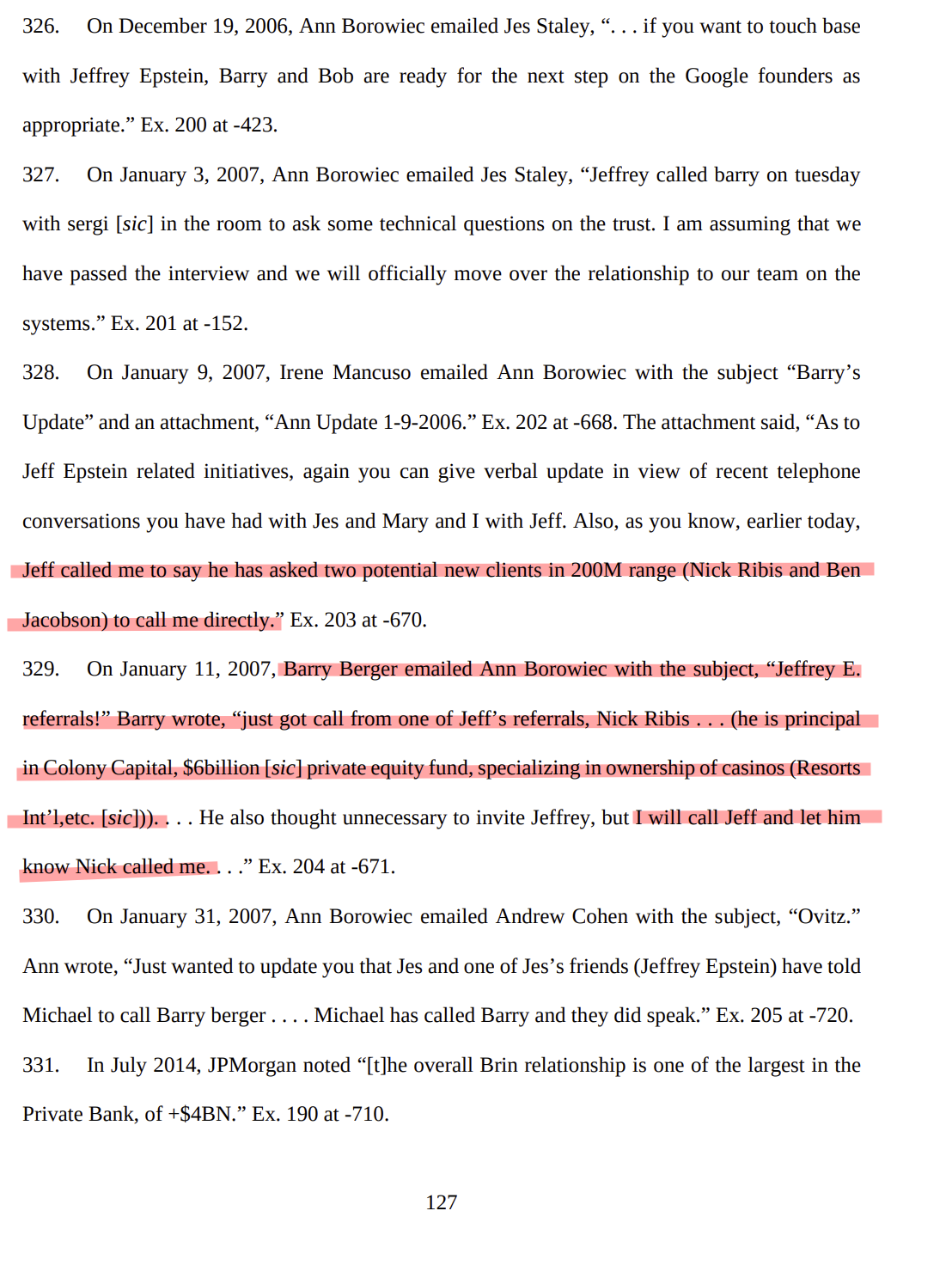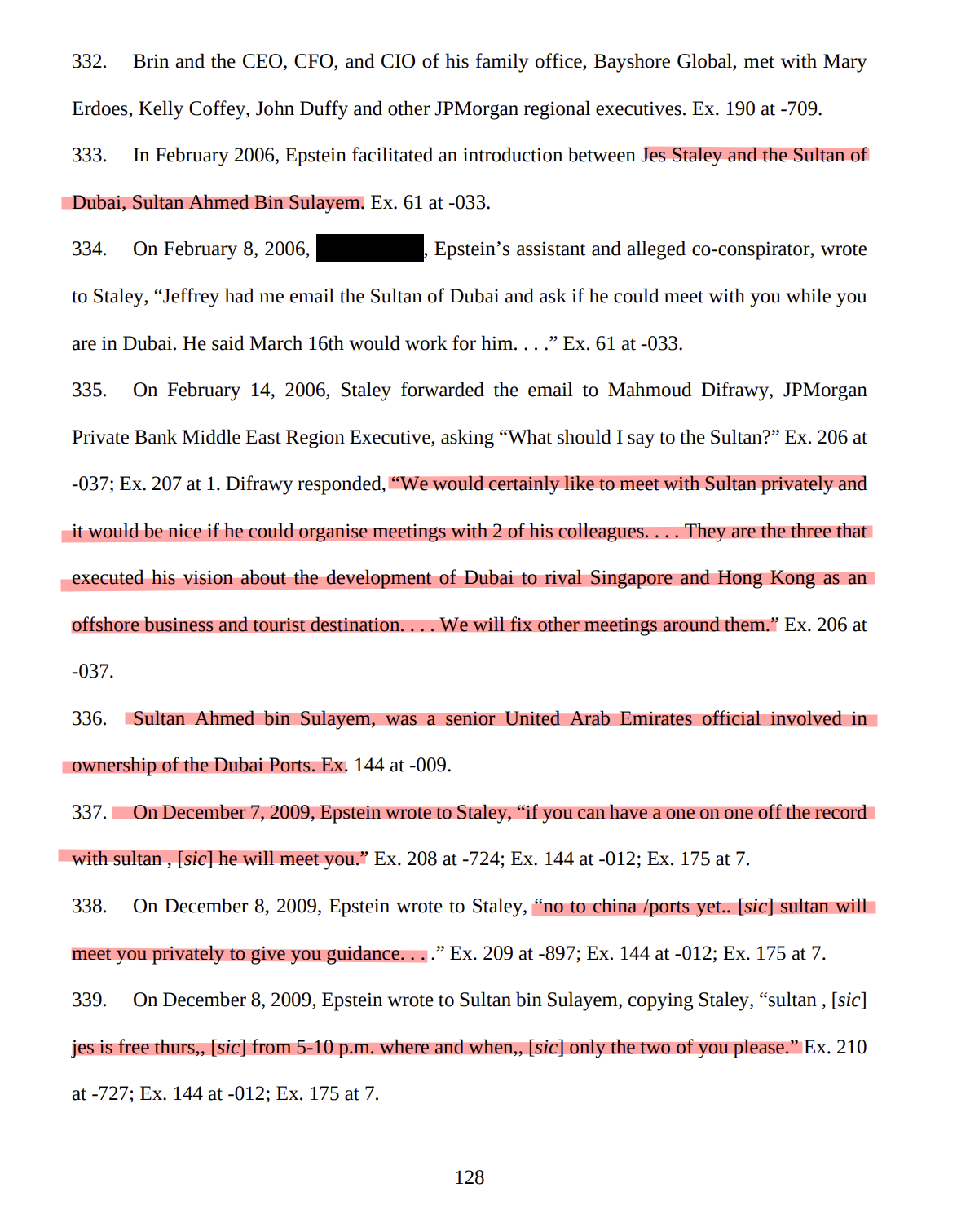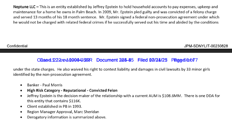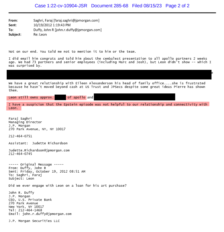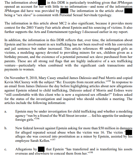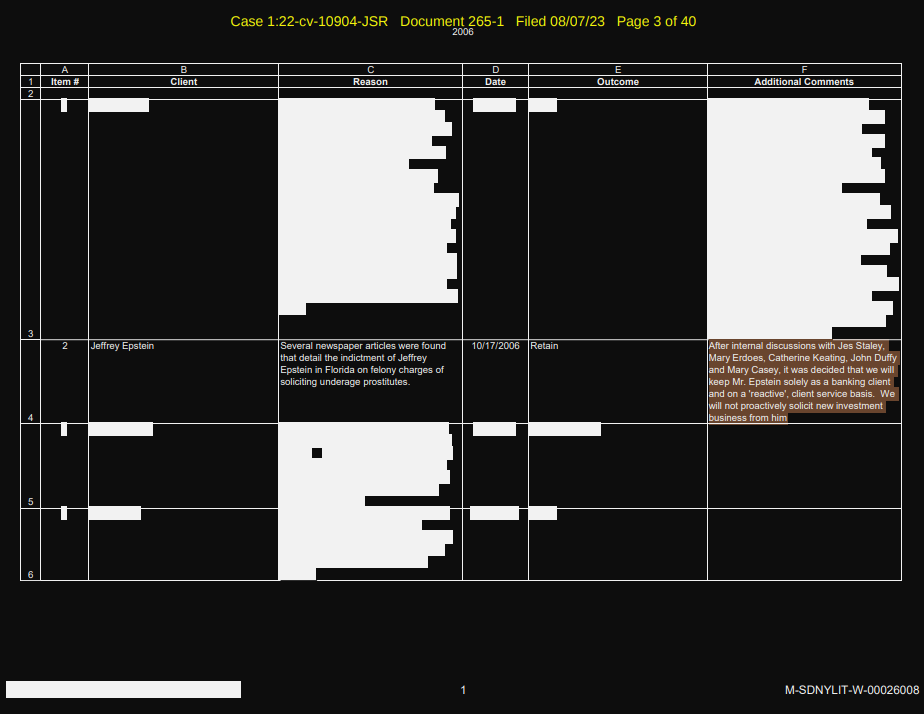 Heavily sealed redacted page shows the people who convinced JPM (check highlight) to keep epstein as a client, further down it says JPM was afraid Epstein was involved in human trafficking and it would reflect poorly on the firm.>After internal discussions with Jes Staley,Mary Erdoes, Catherine Keating, John Duffyand Mary Casey, it was decided that we willkeep Mr. Epstein solely as a banking clientand on a 'reactive', client service basis. Wewill not proactively solicit new investmentbusiness from himKeep in mind this was after his 08 trial.