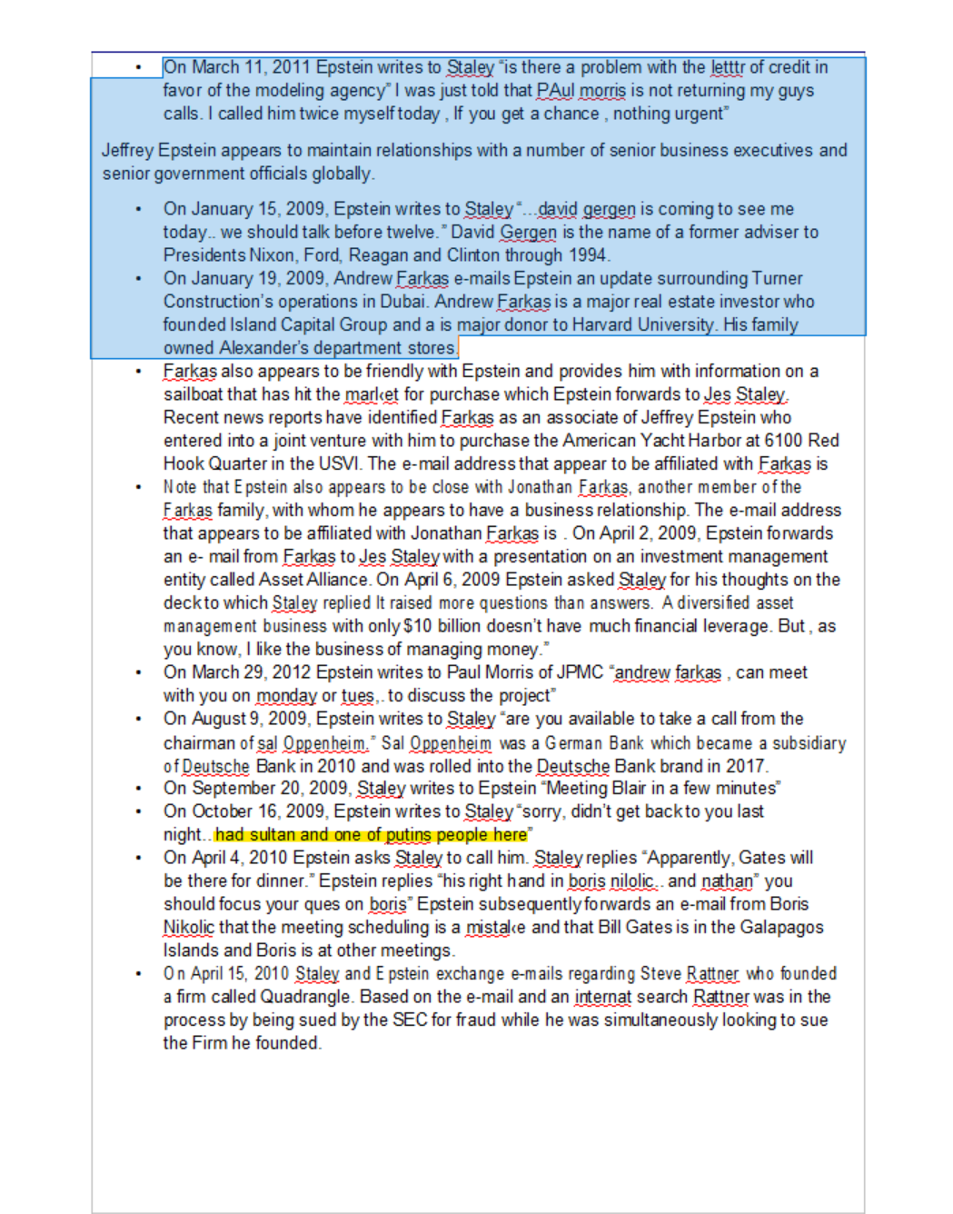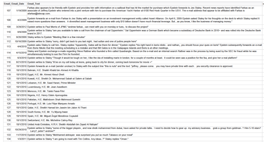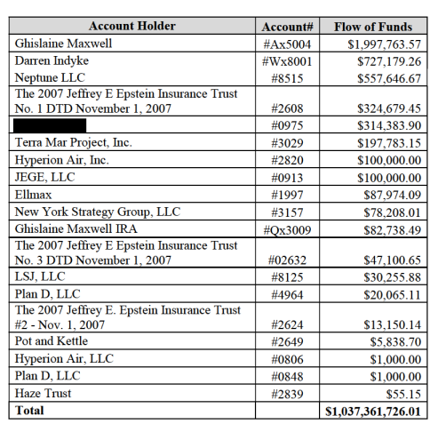 Ahmed Aboul Gheit (Egypt)Ahmed Bin Sulayem (CEO of DPWorld)Alan Dershowitz (Trump Impeachment Lawyer, OJ Lawyer, etc)Alistar Darling (Chancellor of the Exchequer, England)Andrew Farkas (Insignia, Real estate)Barry Berger (Managing Director at JP MORGAN)Ben Jacobson (Real Estate? Forman Capital?)Benjamin Netanyahu (Prime Minister of Israel)Bill GatesSeth Lloyd (MIT Quantum Computing)Brian Greene (Columbia, String Theory)Cecile and John Jongh (Governor and First Lady USVI)David Gergen (Advisor to multiple presidents)Donald John Trump (POTUS)Ehud Barak (Prime Minister of Israel)Elon MuskGhislaine Maxwell (Daughter of Robert Maxwell)Glen Dubin (Hedge Fund, Highbridge Capitol)Henry Odein Ajumogobia (Nigeria)Howard Rubenstein (PR Lawyer)James "Jim" Crown (Senior Board Member at JPMORGAN)Jean Asselborn (Luxembourg)Jean- Luc Brunel (MC2 Modeling agency, supplied young girls)Jes Staley (CEO of JPMORGAN, CEO OF BARCLAYS)Karim Wade (Son of Senegalese President)Katherine Keating (Daughter of Australian Prime Minister)Kathy Ruemmler (Inner Circle OBAMA "White House Council")Ken Starr (Authored STARR REPORT used to Impeach Bill Clinton, Trump Impeachment Lawyer)Lawrence Krause (Origins Institute Phoenix Arizona)Lee Smolin (Perimiter Institute, loop quantum gravity)Leon Black (Apollo Management Hedge Fund)Leonard Susskind (String Theory)Les Wexner (CEO of Victoria's Secret)Luis Filipe Marques Amado (Portugal)Makhdoom Shah Mahmood Qureshi (Pakistan)Mary Erdoes (CEO of Asset Management JP MORGAN)Maurice Sonnenberg (Advisor to multiple presidents)Micheline Calmy- Rey (Switzerland)Miguel Angel Moratinos Cuyaube (Spain)Murray Gell-man (Santa Fe Institute, Quarks)Nick Ribis (Trump Casino Guy, Clinton Lawyer)Patrick Keating (Son of Australian Prime Minister)Paul Keating (Prime Minister of Australia),Peter Mandelson (British Ambassador to the US)Prince Andrew (Duke of York), Jamie Dimon (CEO OF JPMORGAN)