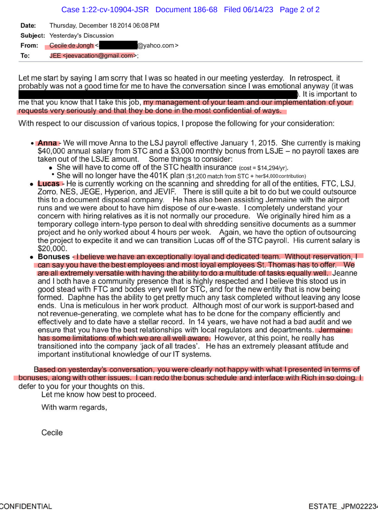 PRIVATE EMAIL BETWEEN WIFE OF USVI GOVERNOR AND EPSTEINS BURNER ACCOUNT DISCUSSING "COMPENSATION" FOR "EMPLOYEES"
