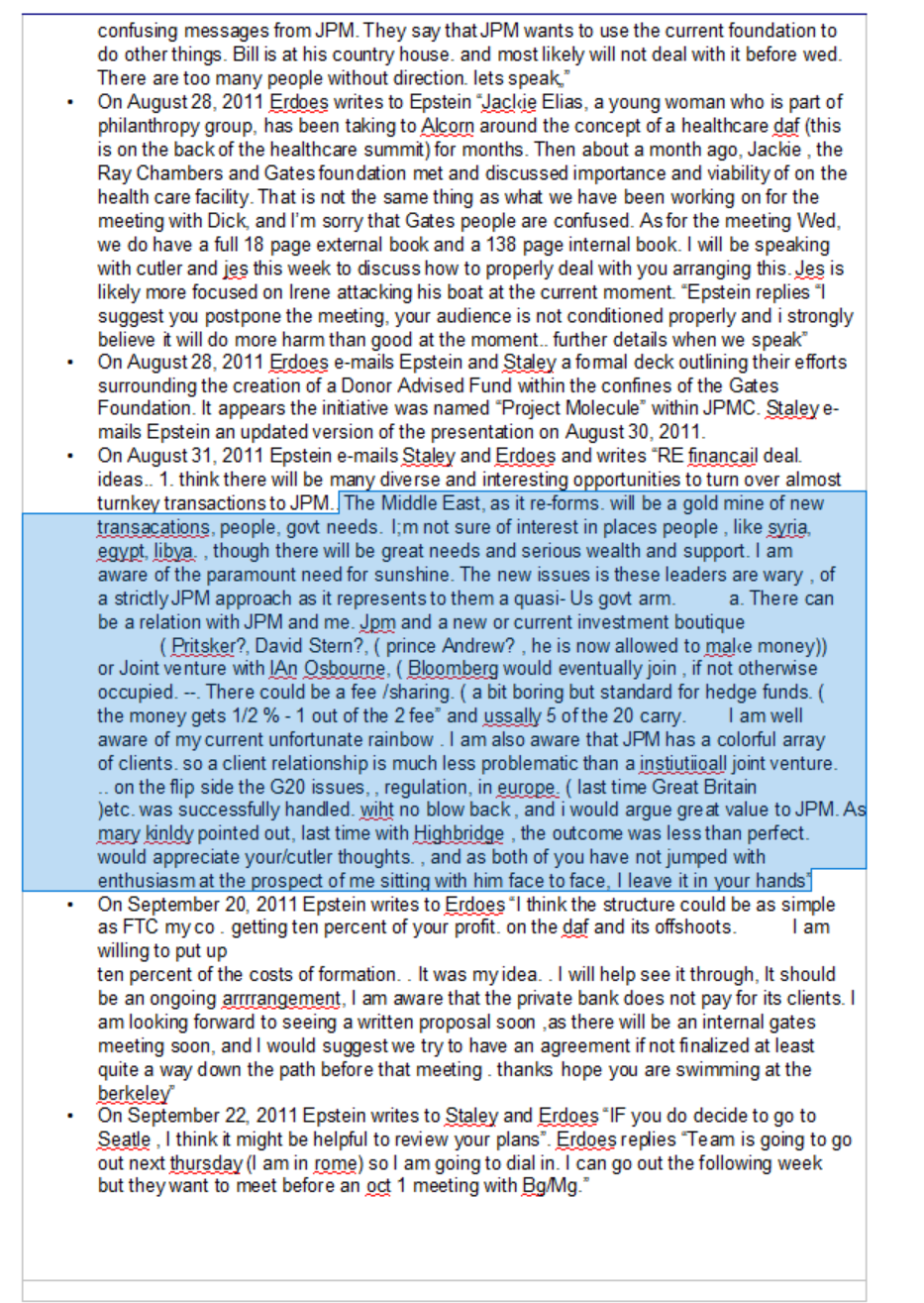 Jeffrey Epstein talking about setting up new 100+ million dollar buy in philanthropy "club" with Mary Erdoes Ceo of asset and wealth management for JP Morgan. For high profile individuals to donate without publicity or if it contradicts their other charities or interests. Bill gates and "his people" are also referenced all over as well."it will be the most exclusive of the clubs".