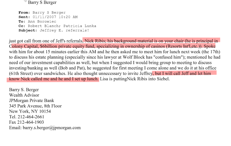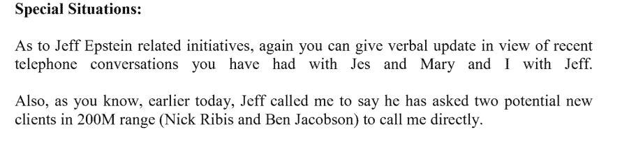 Nick Ribis trusted Epstein enough to ignore the advice to him given by his lawyer at "WolfBank" in regards to moving the management his 6 billion net worth to JPMorgan.