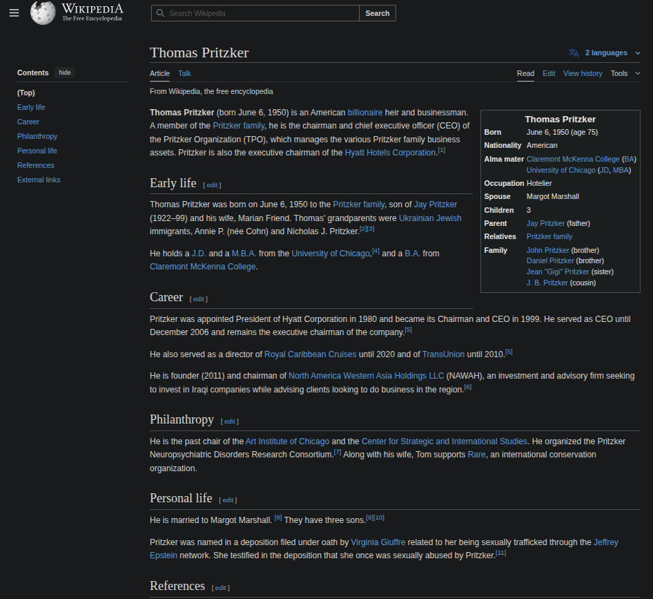 I am trying to find the page I saw it but American Billionaire Thomas Pritzker, of the Pritzker family and Hyatt hotels was there. He was accused by Virginia Giuffre as well. His wiki has it on there.