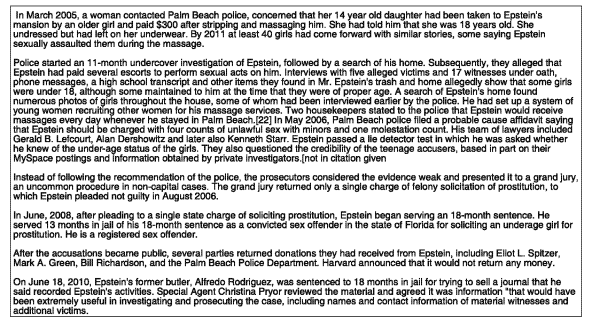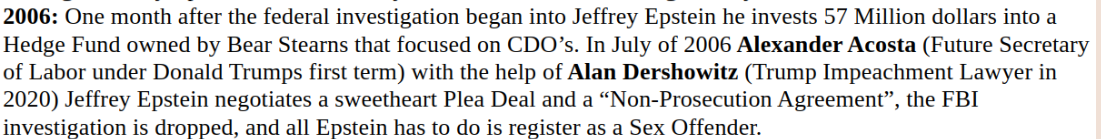 >1999 - 2000: Bill Clinton repeals Glass-Steagall and immediately Jeffrey Epstein founds a new company with the help of Bear Stearns (who owned 40%) called Liquid Funding a company that specializes in Callateralized Debt Obligations (CDOs) that had just become recently legal with the repeal of Glass-Steagall. CDO’s would later go on to become the cause of the 2008 Global Financial Crisis.>2003: Jeffrey Epstein initiates a sale of a Hedge Fund owned by Bear Stearns known as “Highbridge Capital” to JP Morgan and Epstein is paid $15 Million (likely much more off the books) for “Advice”>2005: First victim comes forward who alleges her 14 year old step-daughter was paid $300 to “strip and massage” Jeffrey Epstein. This eventually escalates into a full investigation by the FBI in 2006.>2006: One month after the federal investigation began into Jeffrey Epstein he invests 57 Million dollars into a Hedge Fund owned by Bear Stearns that focused on CDO’s. In July of 2006 Alexander Acosta (Future Secretary of Labor under Donald Trumps first term) with the help of Alan Dershowitz (Trump Impeachment Lawyer in 2020) Jeffrey Epstein negotiates a sweetheart Plea Deal and a “Non-Prosecution Agreement”, the FBI investigation is dropped, and all Epstein has to do is register as a Sex Offender.>2007: On April 18th, 2007 Jeffrey Epstein pulls out 57 Million that he had invested the Bear Stearns Hedge Fund the year prior. At the time, the fund had a leverage ratio of 17:1, which meant for every dollar invested at that hedge fund there were 17 dollars worth of debt, Epsteins 57 million would have been the equivalent of pulling out over $1 BILLION from the CDO market which was about to burst; this resulted in the collapse of the fund and the collapse of Bear Stearns itself only a few weeks later.