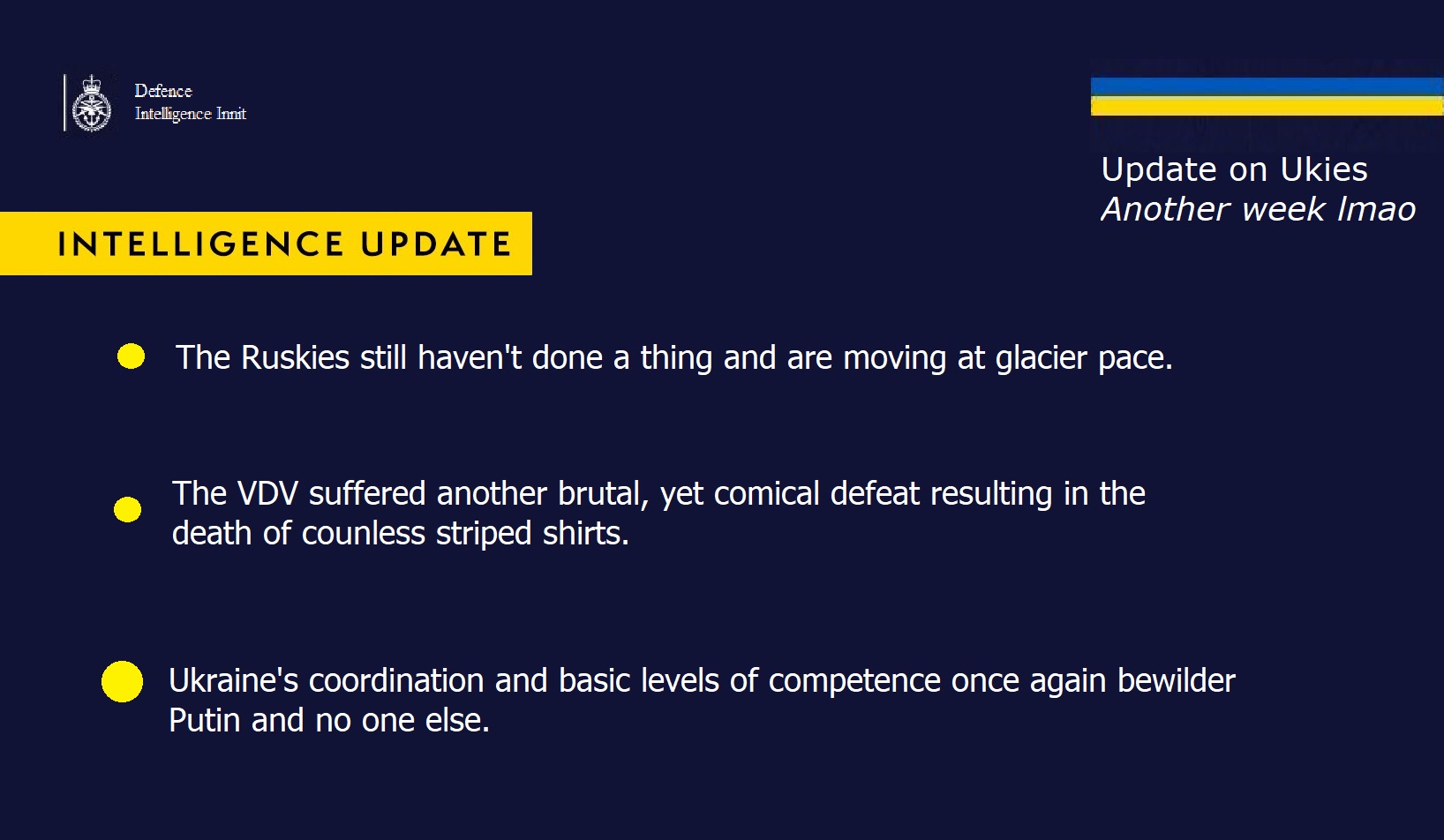 >>524295120>British Intelligence!The same fags that said Russia would run out of missles and food and gas after 2 weeks! The same fags that have done absolutely nothing but make excuses to justify the constant losses on the battlefield. My dog has better intelligence.