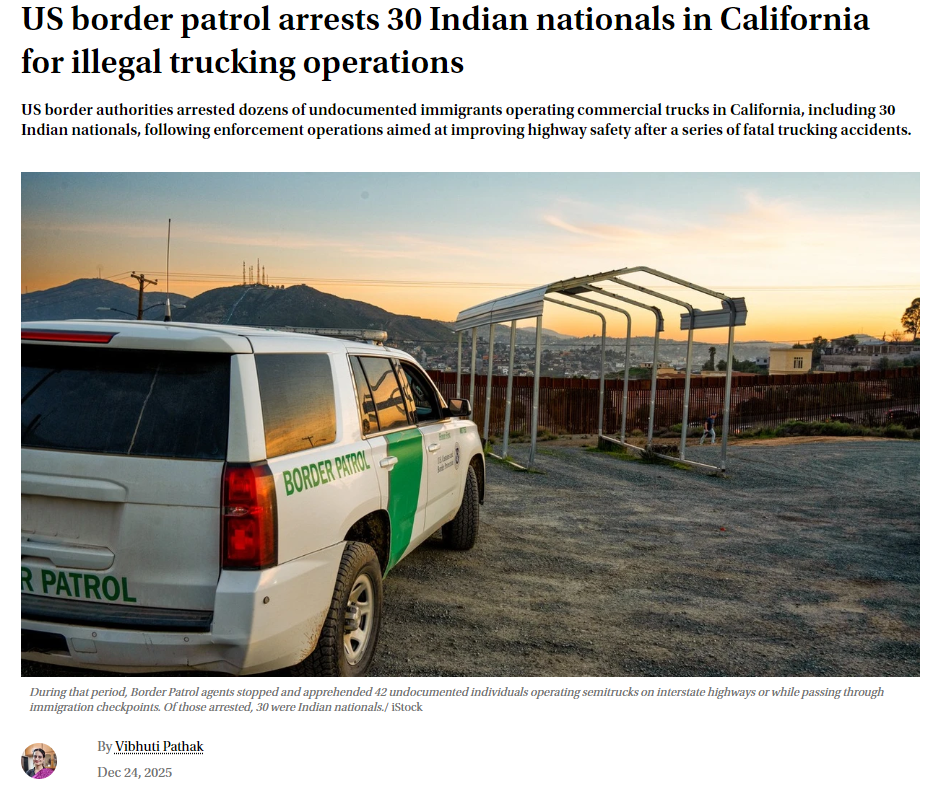 >US border authorities arrested dozens of undocumented immigrants operating commercial trucks in California>According to U.S. Customs and Border Protection (CBP), agents in the El Centro Sector apprehended a total of 49 undocumented immigrants holding commercial driver’s licenses. Of those arrested, 30 were Indian nationals.>The arrests were part of a broader enforcement effort in California targeting undocumented truck drivers amid growing concerns about public safety.https://www.indiaweekly.biz/indians-arrested-california-us-borderpatrol/