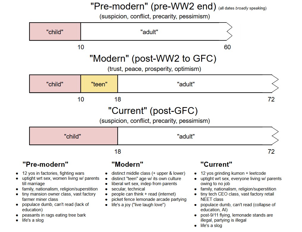 - Australia has a new law banning people from using Snap and IG before 16, which has 77% approval (I was born in '04 and dl'ed them at 14); UK is similar; US + EU likely to follow- A lot of "teen" culture (e.g. Disney/Nick shows set in MS/HS) is now considered creepy when it wasn't really even well into the 2010s- Even offline, teen spaces are diminishing due to no business- Harder to party or even "play outside" these days since parents + authorities are better at rooting that shit out, shutting shit down (e.g. some malls banning teens)- Sex for any reason is considered taboo for any reason pre-18 owing to literal interp of consent laws, even among same age groups + jurisdictions that use pre-18 AOCs; widespread fear of cancellation for doing anything that could be considered even slightly sexual- Hard to do much w/o a car in most of the Anglo countries if you don't live in the top 3 most expensive cities' downtowns; fewer teens getting their licenses- It takes a lot more EC's + studying to even make it at all in this world, thus time off from leisureMy 2030s forecasts:- "no bf/gf until you're 18" becoming a standard notion- HS prom being cancelled to save money and it being retrospectively being deemed creepy- skirts/dresses being deemed explicit attire kids shouldn't be wearing- feet being deemed an intimate body part- strict enforcement of MPAA/ESRB ratings, "sorry kiddo u can't buy smash bros come back when ur 13"; parents giving kids access to age restricted stuff becoming as penalizable an offense as parents showing kids porn- social shame helping enforce these a la covid- racism/"LGBTphobia" not "solved", in fact similar dynamics to today just hella more toxic; Karens rule supreme- a hot war, and our best men dying in it not bc of a draft a la Vietnam, but enlistment being the best/only option for the un/underemployed