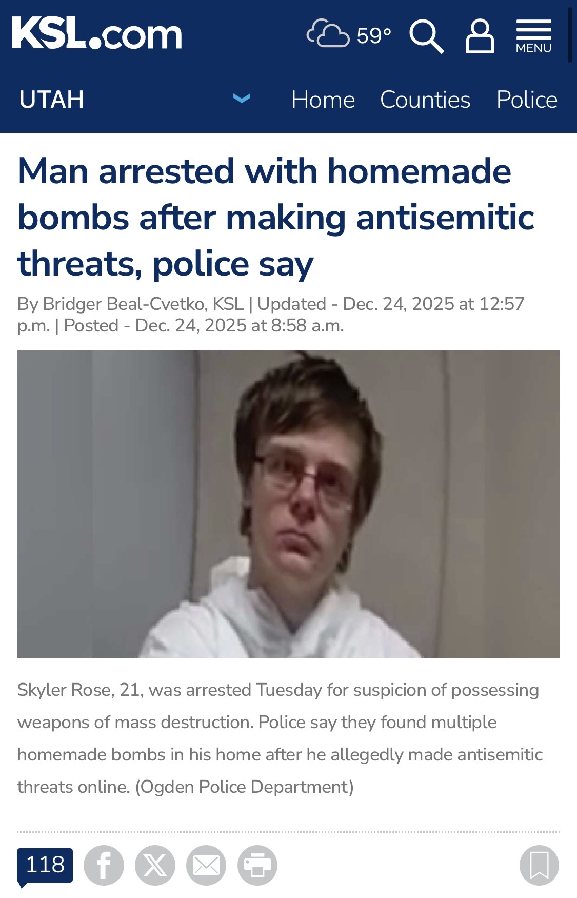 Skyler Rose, 21, was arrested Tuesday for suspicion of possessing weapons of mass destruction. Police say they found multiple homemade bombs in his home after he allegedly made antisemitic threats online. (Ogden Police Department)THERE WILL BE NO ANTISEMITISM IN UTAH MAGA!!! https://www.ksl.com/article/51423397/man-arrested-with-homemade-bombs-after-making-antisemitic-threats-police-say