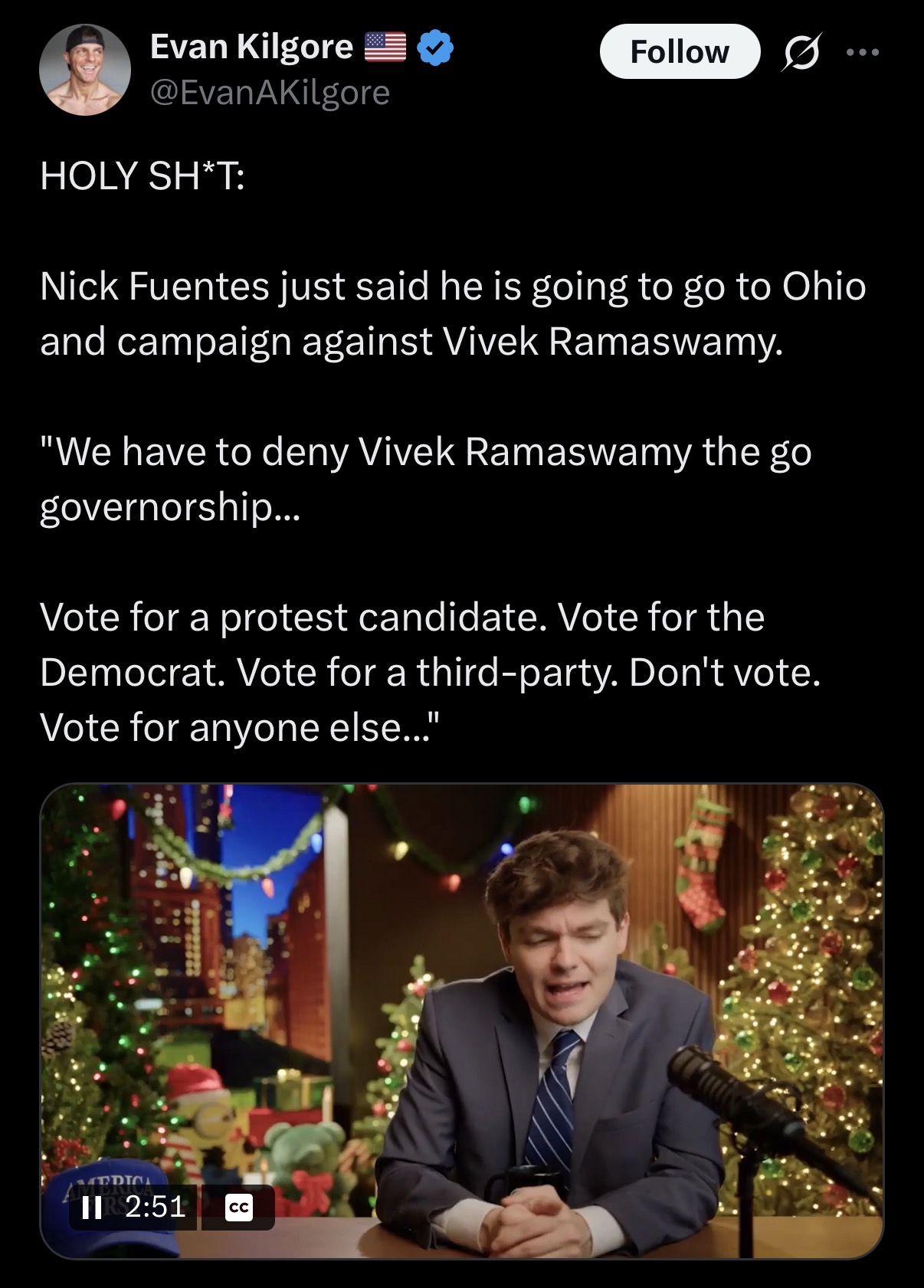 >>524309906he's rightVivek losing is a statement that needs to be madewe can't allow this kind of:>"you're just as american as anybody else as long as you salute the flag hard enough"bullshit