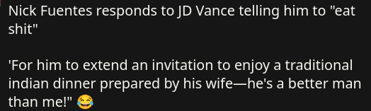 >>524315023well apparently nobody is going to stem the flow of jeets, so get used to itthe mainstream GOP position is that all Indians are welcome because they salute the flag super hard and they respect the constition and shit, and if you really think about it they're more american than apple pie and george washingtonyou should be like piers morgan and be thankful for the currythat's your new governor of fucking ohio, at the pace we're onbut people want to counter-signal nick fuentes attacking this anchor-baby indian because they hate nick more?doesn't make sense, but you choose your own fate >>524315070according to what numbers? you can't find them because they haven't posted them since the inauguration