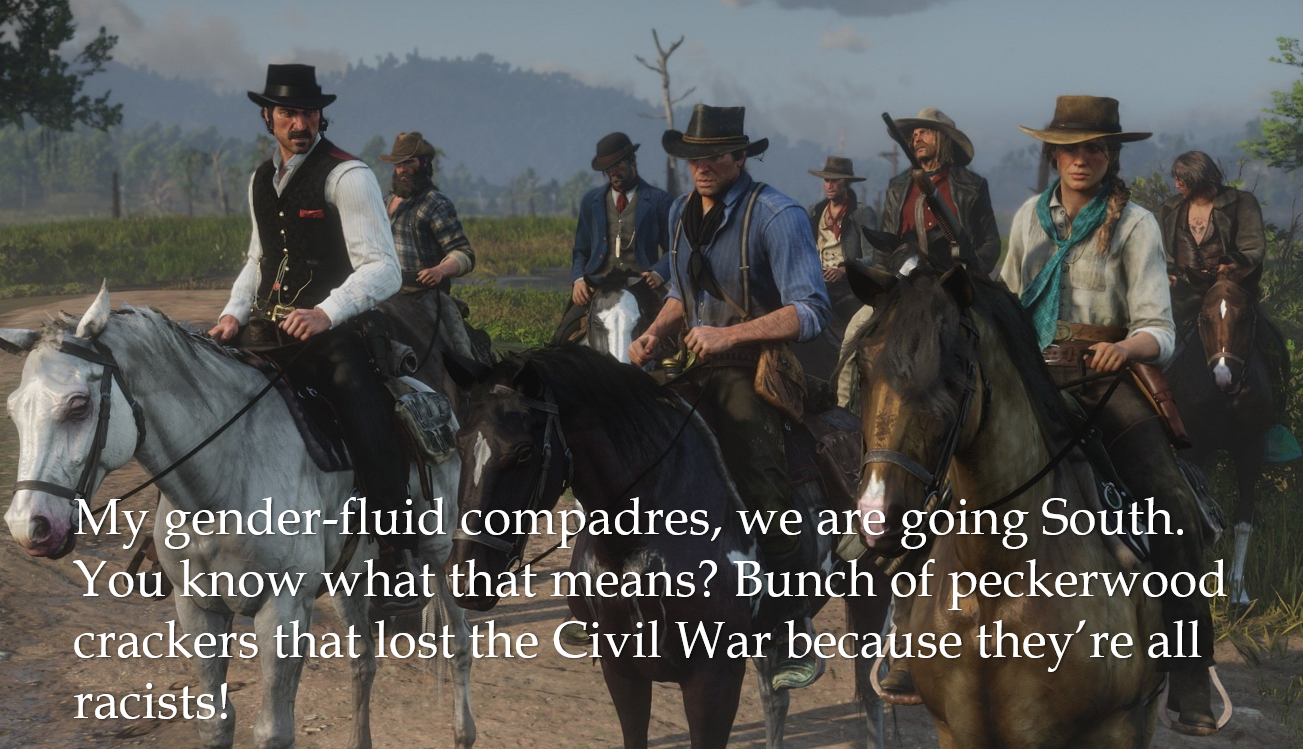 >>524323274>RDR2 was extremely gay.OH LOOK GUYS WE CAN STICK IT TO THE NAZIS....ER...KLAN WE ARE THE HEROES!