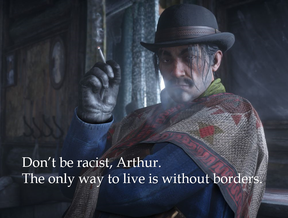 >>524318240with the greet/antagonise thing, if you first be friendly and then antagonise, i swear i’ve had arthur say this to specifically black characters>great day today huh?>… well, until YOU came around