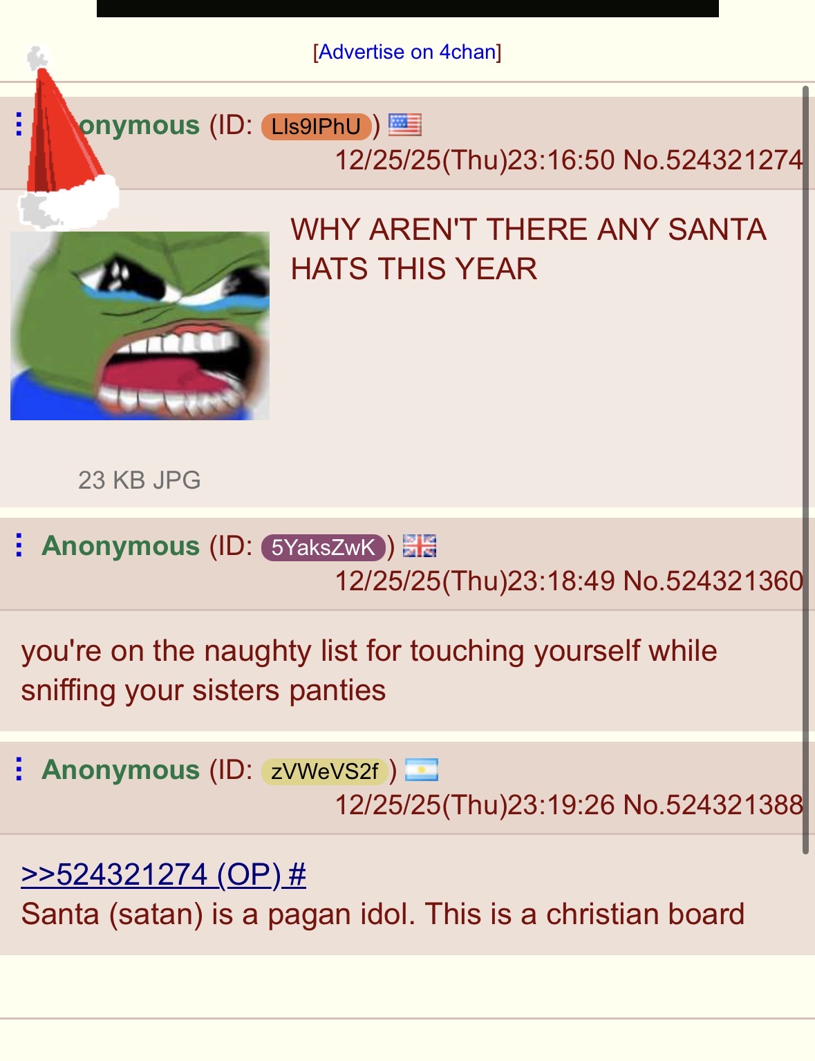 >>524321274Santa (satan) is a pagan idol. This is a christian board